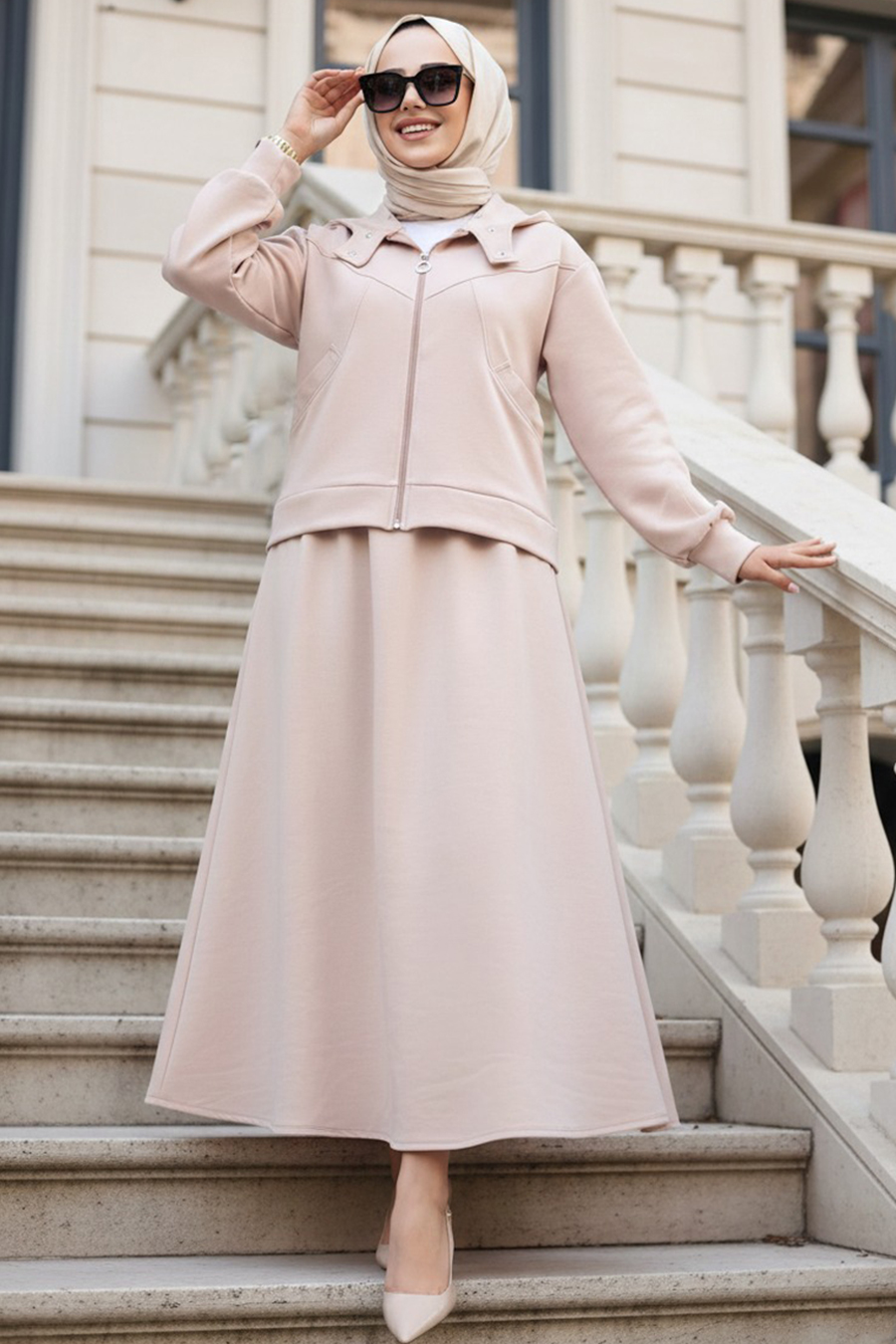 Ürün Özelliği: Sıfır yaka, uzun kollu, kapüşonlu, ön ortadan fermuarlı, eteği belden lastikli, yanlardan cepli ve kloş kesimdir.