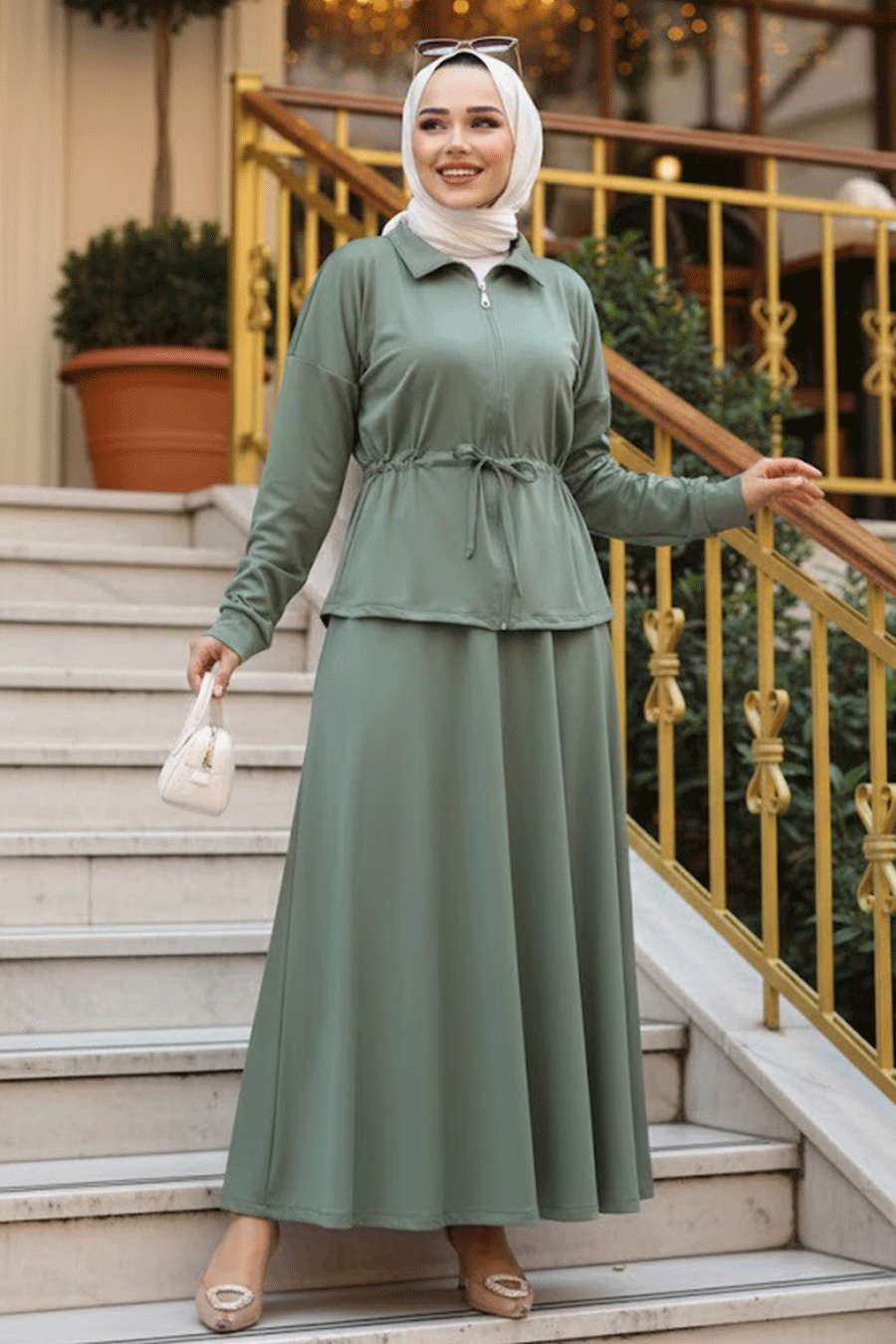 Ürün Özelliği: Dik yaka, uzun kollu, ön ortadan fermuarlı, belden bağcıklı, eteği belden lastikli ve kloş kesimdir.
