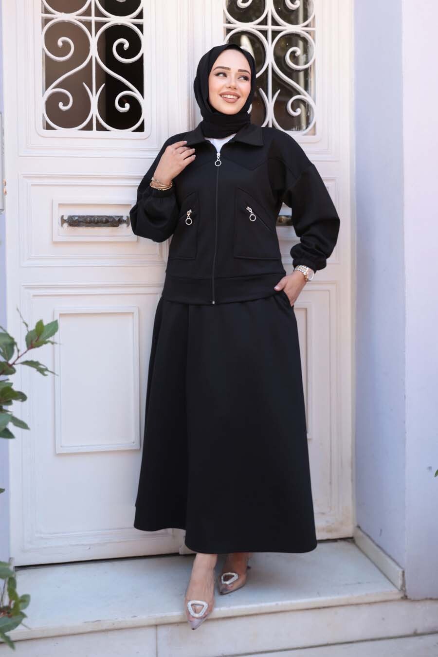 Ürün Özelliği: Klasik yaka, uzun kollu, kol ucu lastikli, ön ortadan fermuarlı, yanlardan fermuarlı cepli, eteği belden lastikli, yanlardan cepli ve kloş kesimdir.