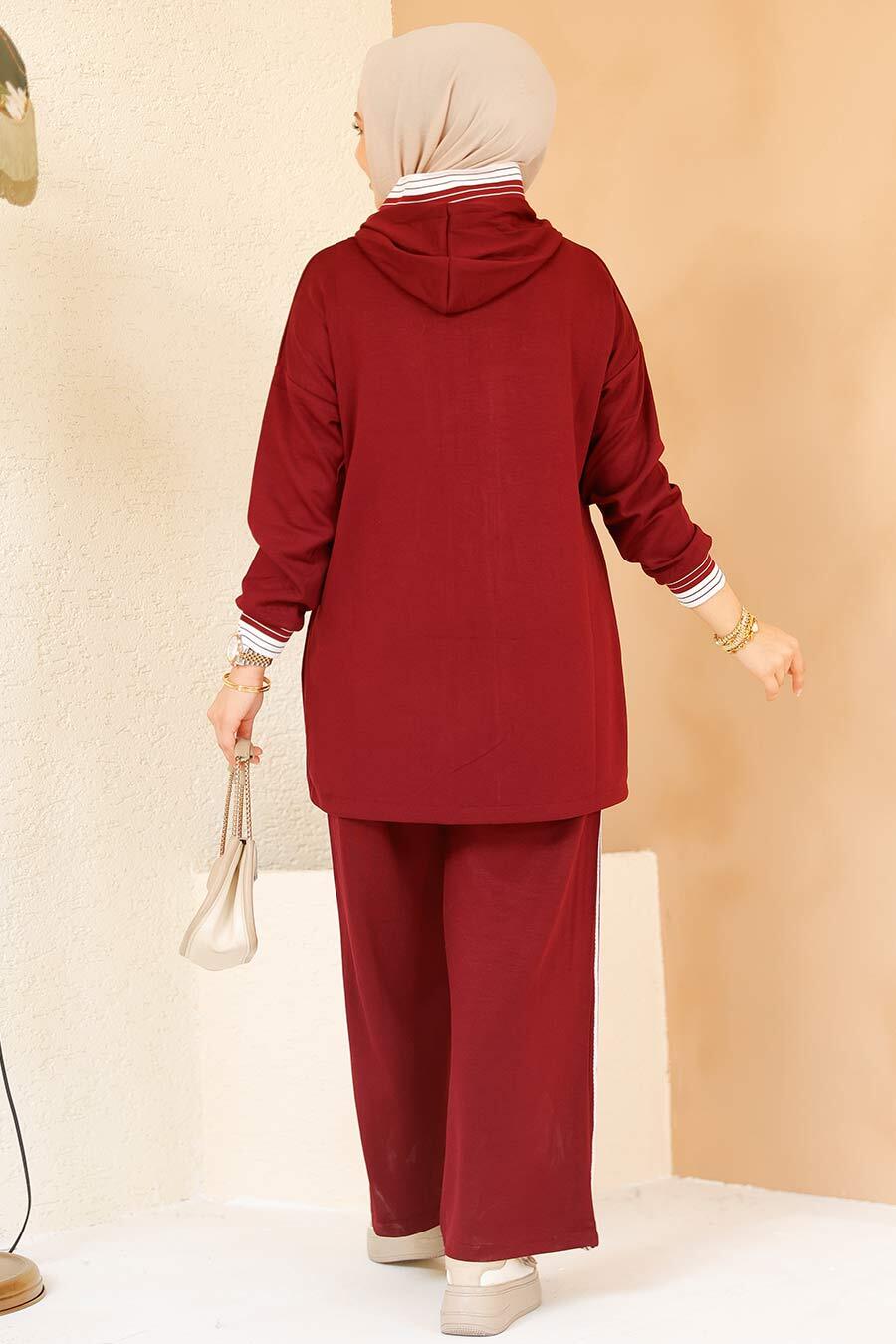 Ürün Özelliği: Sıfır yaka, uzun kollu, kapüşonlu, kol ucu lastikli, ön ortadan fermuarlı, şerit detaylı, pantolon belden lastikli, boru paça ve şerit detaylıdır.