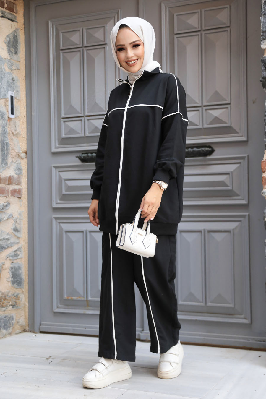 Ürün Özelliği: Dik yaka, uzun kollu, kol ucu lastikli, etek ucu lastikli, ön ortadan fermuarlı, şerit detaylı, pantolon belden lastikli ve boru paçadır.