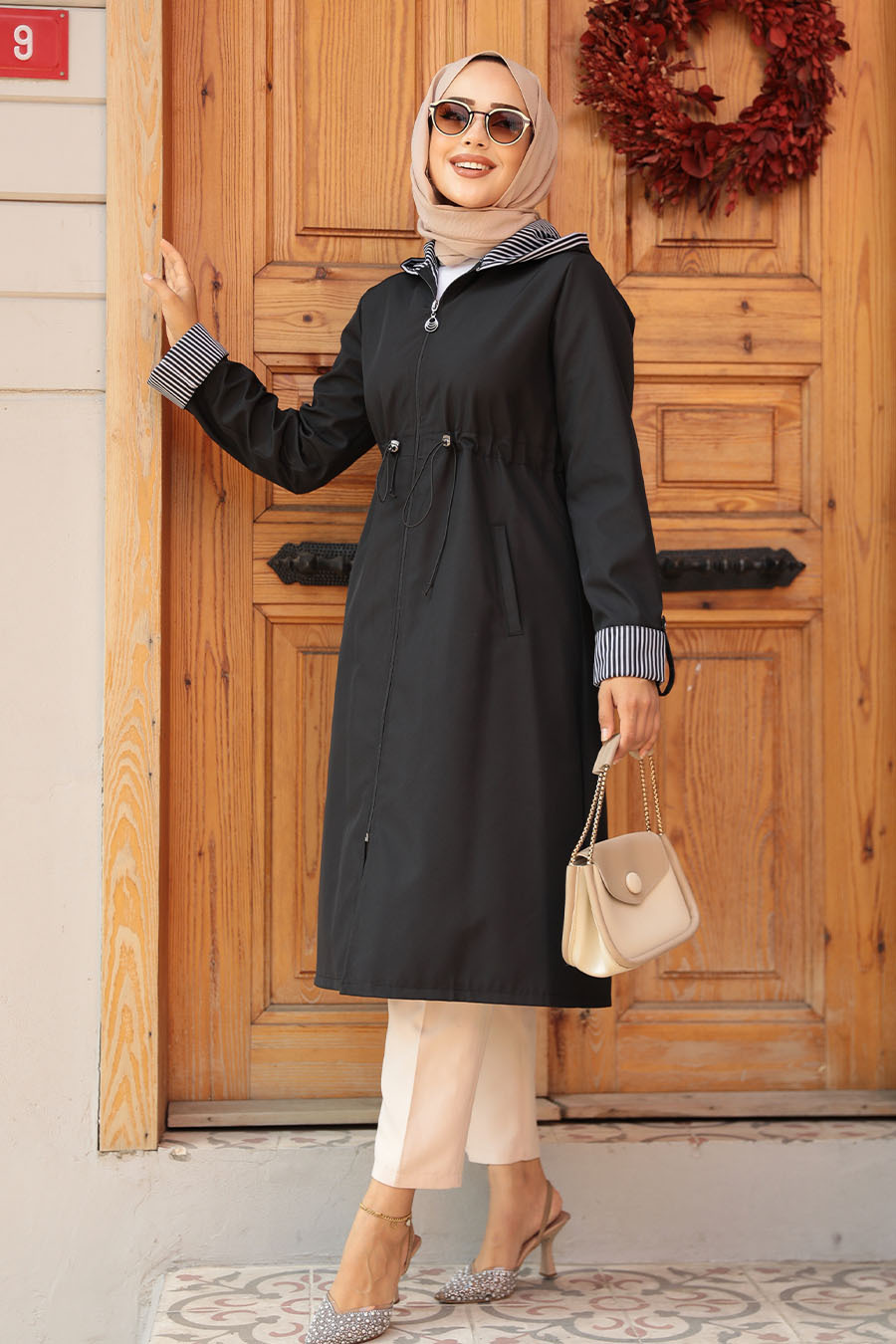 Ürün Özelliği: Sıfır yaka, uzun kollu, kapüşonlu, yanlardan cepli, ön ortadan fermuarlı ve belden bağcıklıdır.