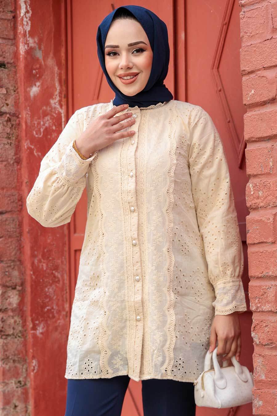 Ürün Özelliği: Sıfır yaka, uzun kollu, manşetli, güpürlü ve ön ortadan düğmelidir.