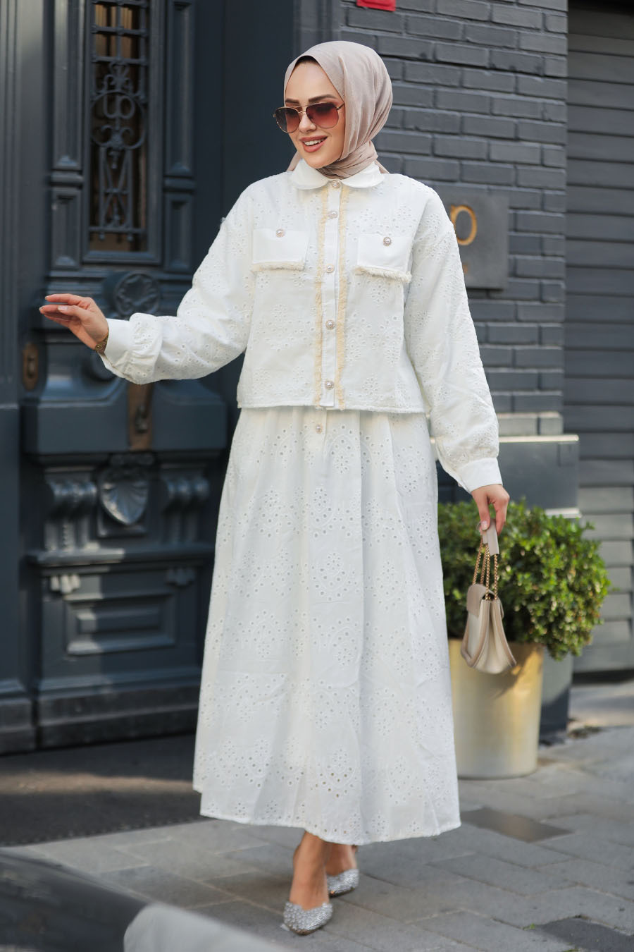 Ürün Özelliği: Klasik yaka, uzun kollu, manşetli, cep detaylı, ön ortadan düğmeli, güpürlü, etek belden lastikli, astarlı ve eteği kloş kesimdir.