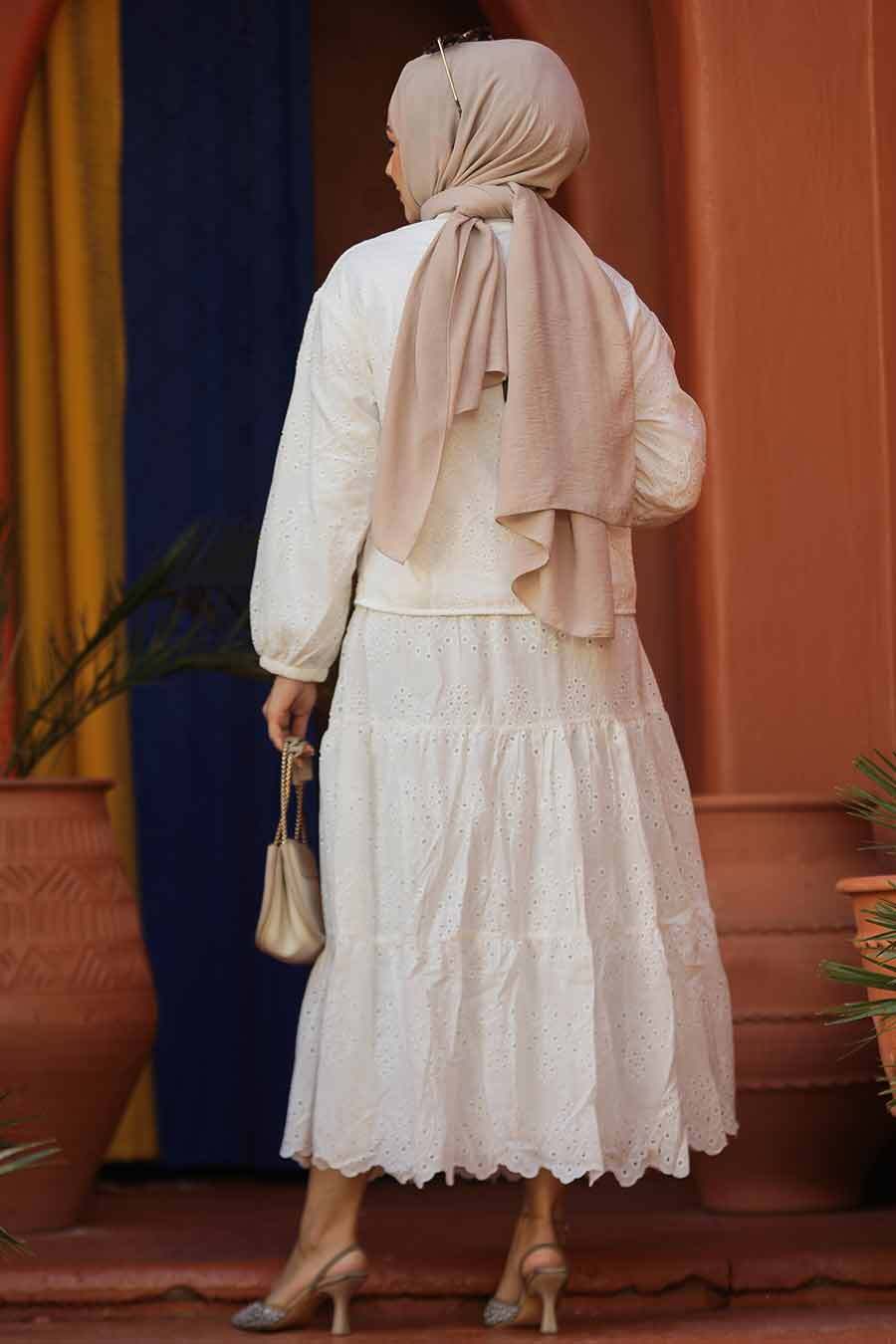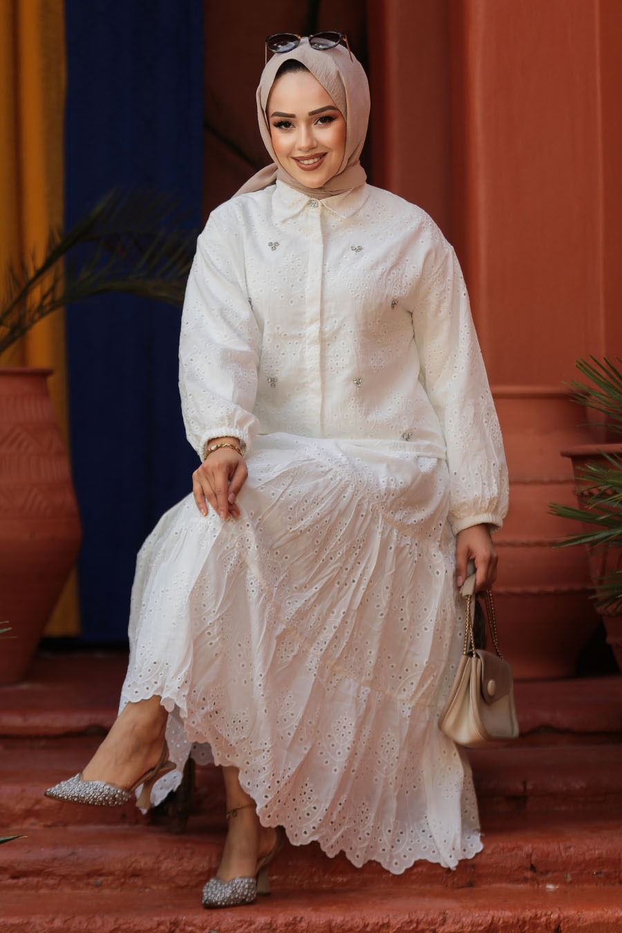 Ürün Özelliği: Klasik yaka, uzun kollu, kol ucu lastikli, ön ortadan düğmeli, güpürlü, etek belden lastikli, kat piliseli, astarlı ve eteği kloş kesimdir.
