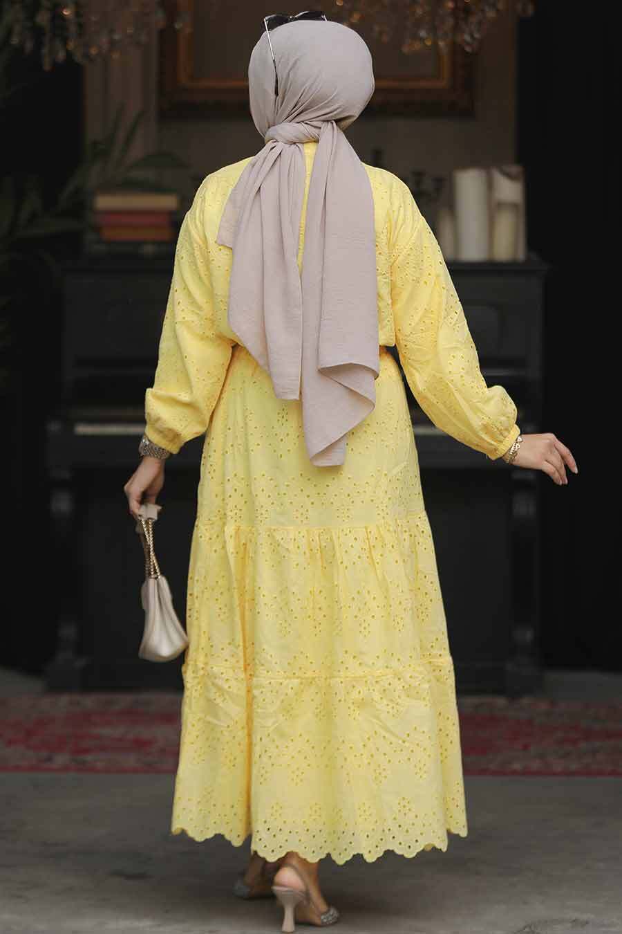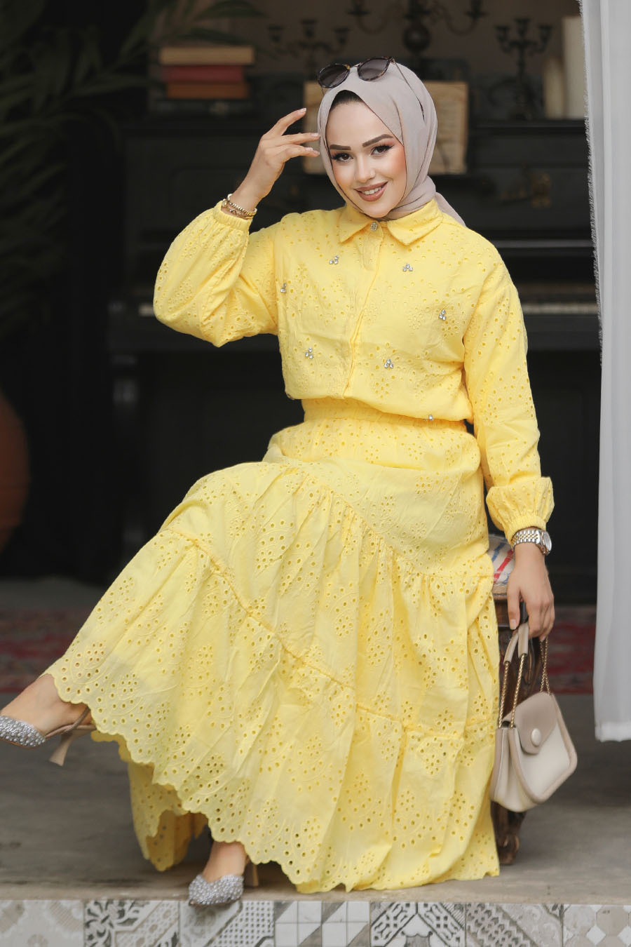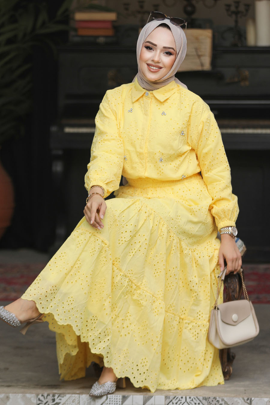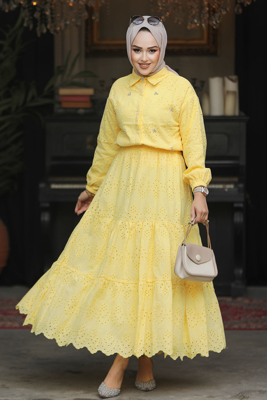 Ürün Özelliği: Klasik yaka, uzun kollu, kol ucu lastikli, ön ortadan düğmeli, güpürlü, etek belden lastikli, kat piliseli, astarlı ve eteği kloş kesimdir.