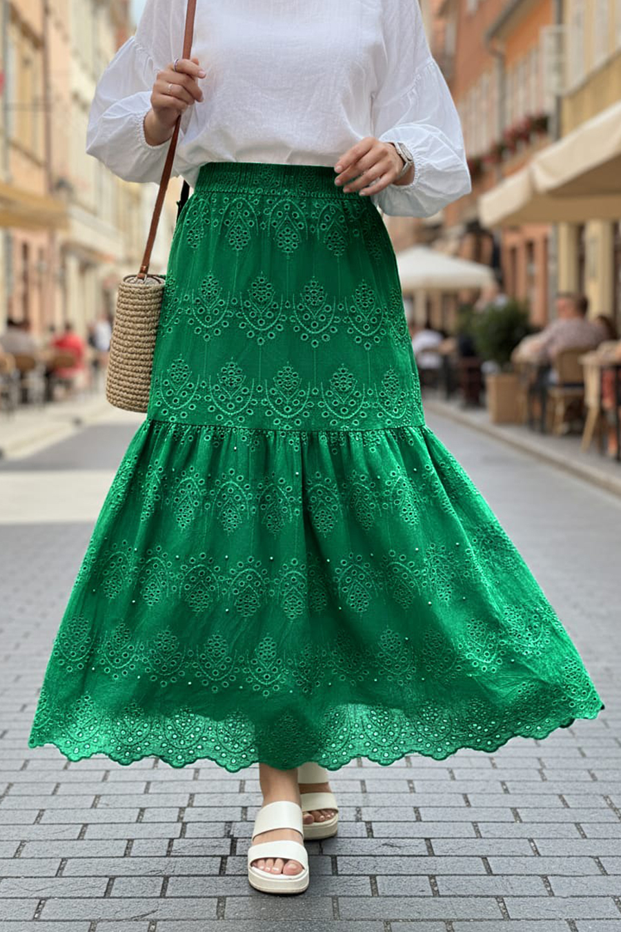 Ürün Özelliği: Etek belden lastikli, güpürlü, inci işlemeli, pilise detaylı ve astarlıdır.