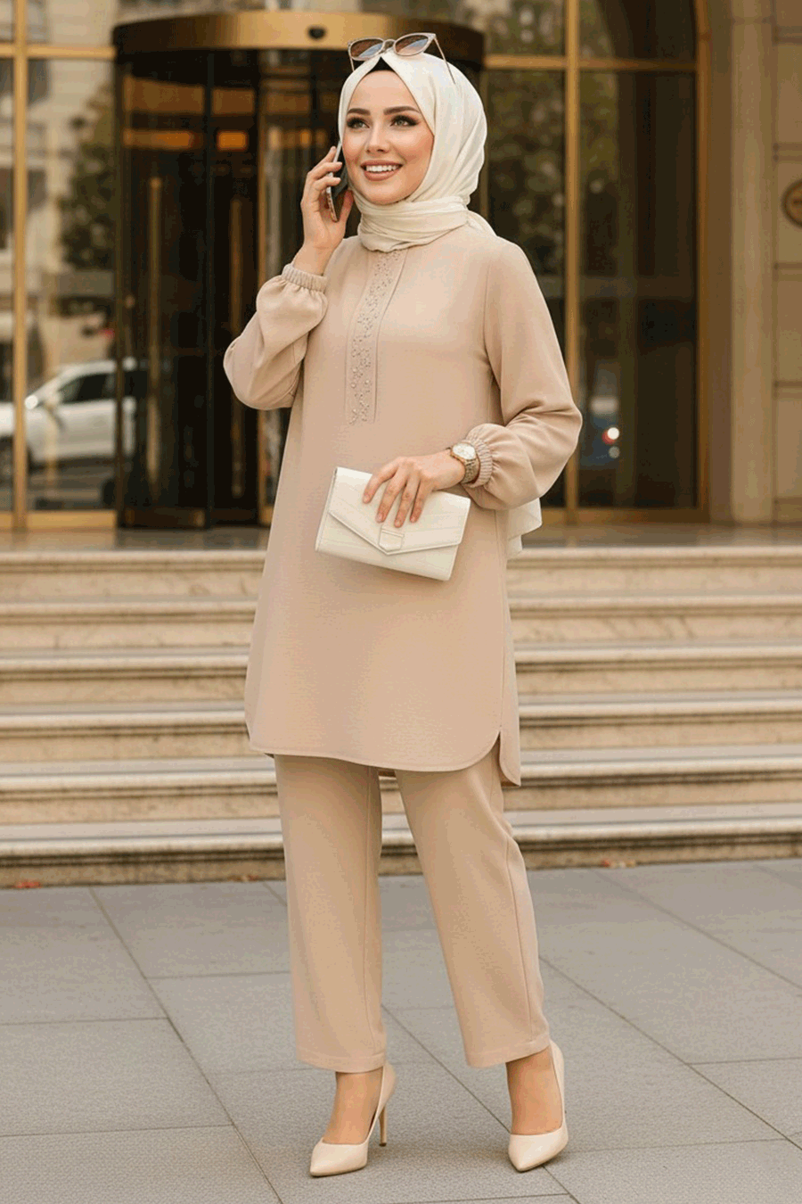 Ürün Özelliği: Dik yaka, uzun kollu, kol ucu lastikli, ön ortadan düğmeli , inci detaylı, pantolon belden lastikli ve dar paçadır.