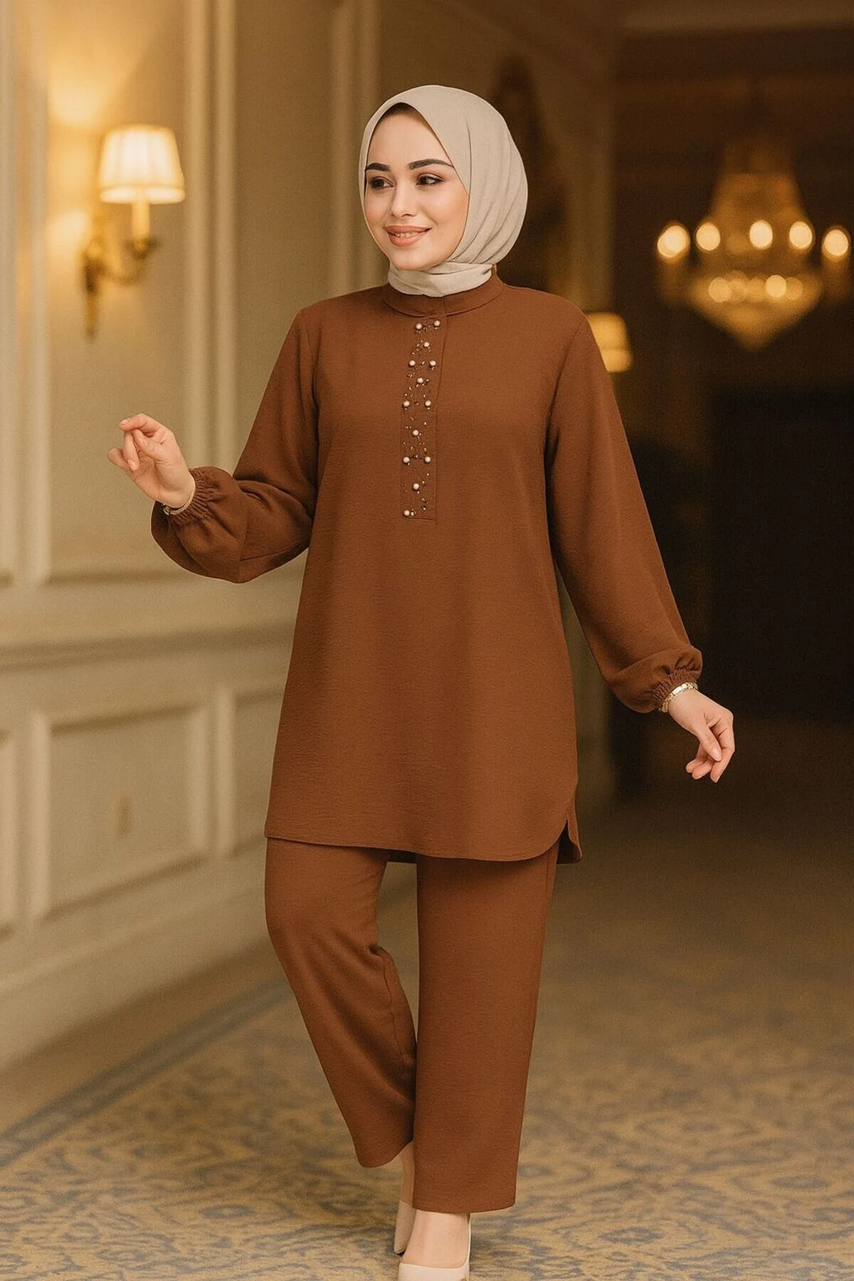 Ürün Özelliği: Dik yaka, uzun kollu, kol ucu lastikli, ön ortadan düğmeli , inci detaylı, pantolon belden lastikli ve dar paçadır.