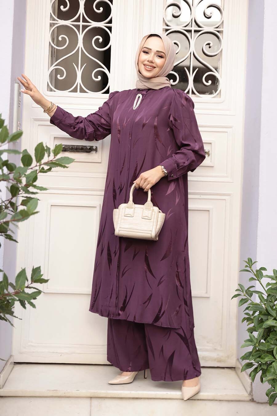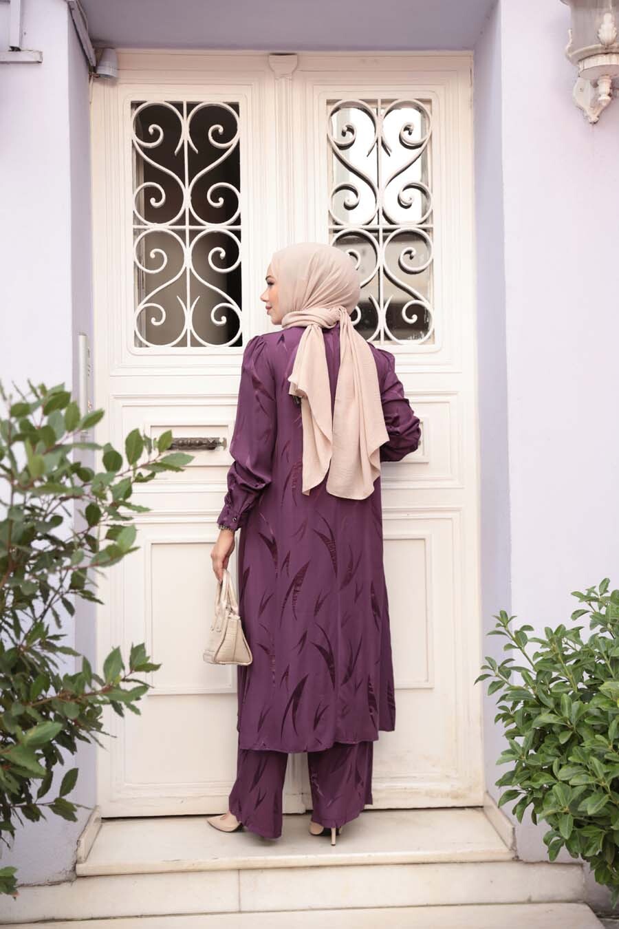 Jakarlı Mürdüm Tesettür İkili Takım 76672MU