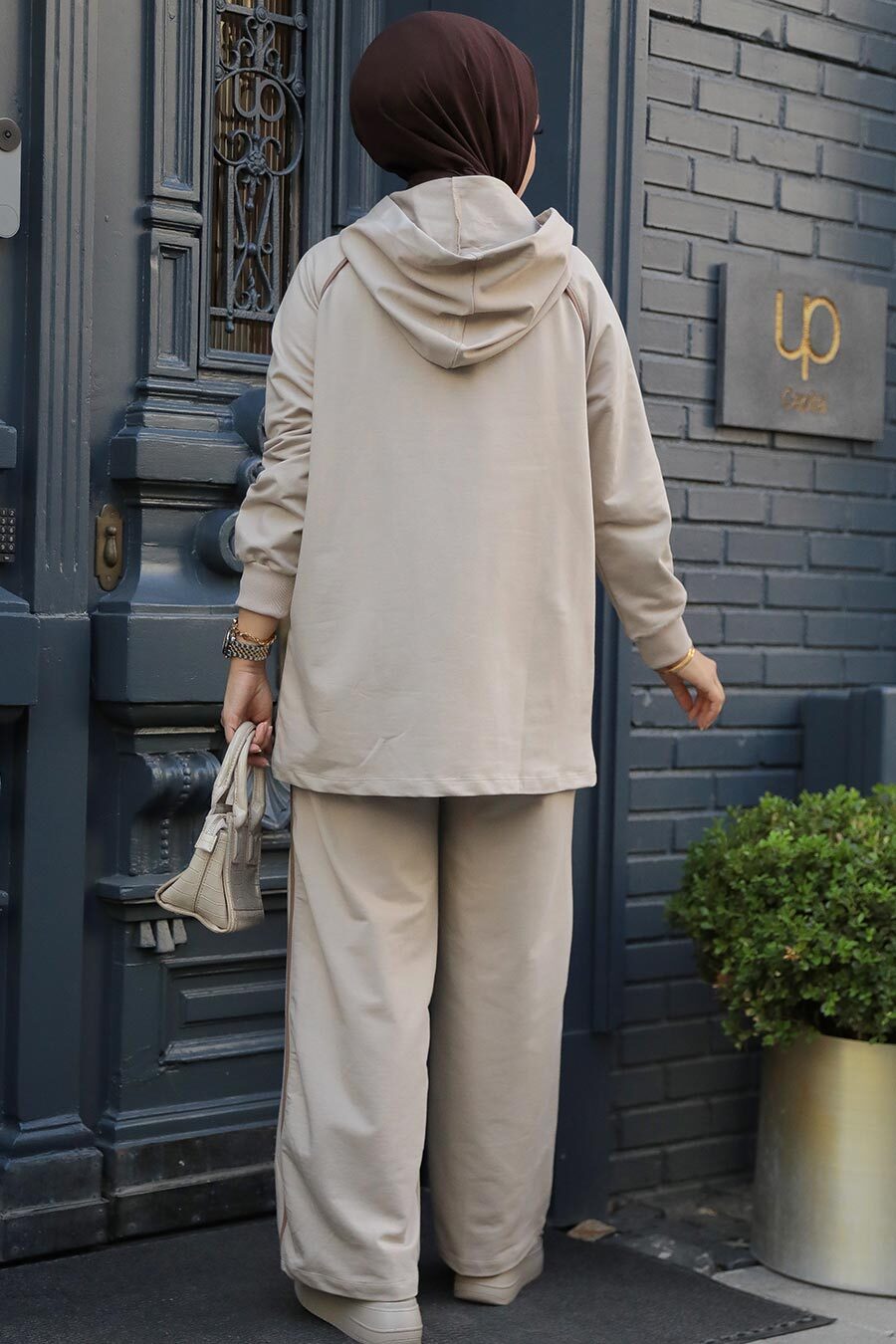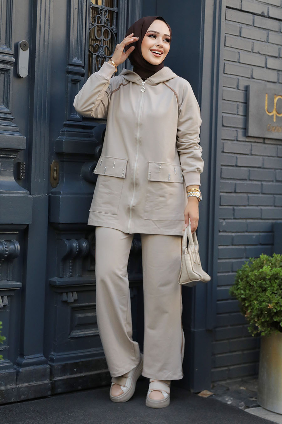 Ürün Özelliği: Sıfır yaka, kapüşonlu, uzun kollu, kol ucu lastikli, cep detaylı, ön ortadan fermuarlı, boncuk detaylı, pantolon yanlardan şeritli ve boru paçadır.