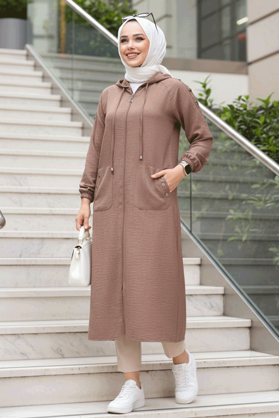 Kumaş Özelliği: %90 Polyester %10 Likralı kumaştan üretilmiştir. Ürün Özelliği: Kapüşonlu, uzun kollu, kol ucu lastikli, yanlardan cepli ve ön ortadan fermuarlıdır.