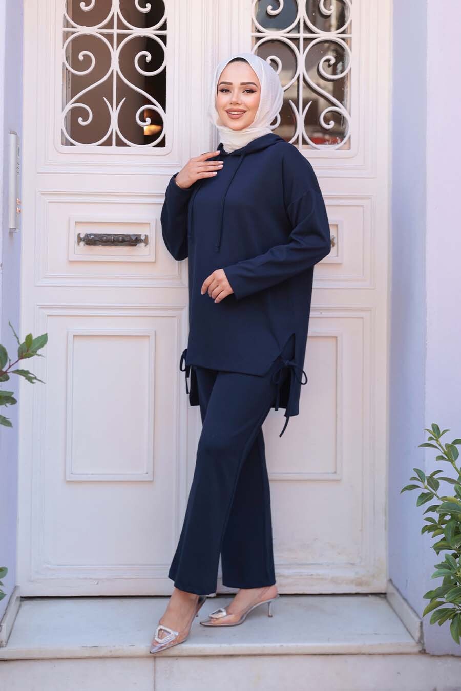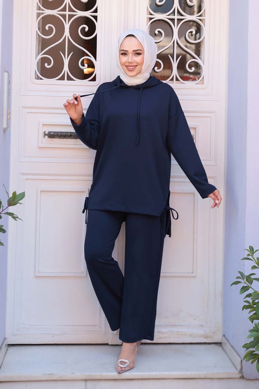 Ürün Özelliği: Sıfır yaka, uzun kollu, kapüşonlu, arkası uzun, etek ucu yırtmaçlı, yanlardan bağcıklı, pantolon belden lastikli ve boru paçadır.