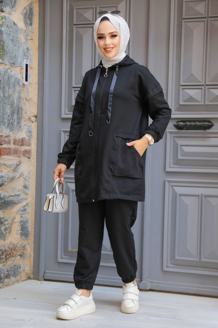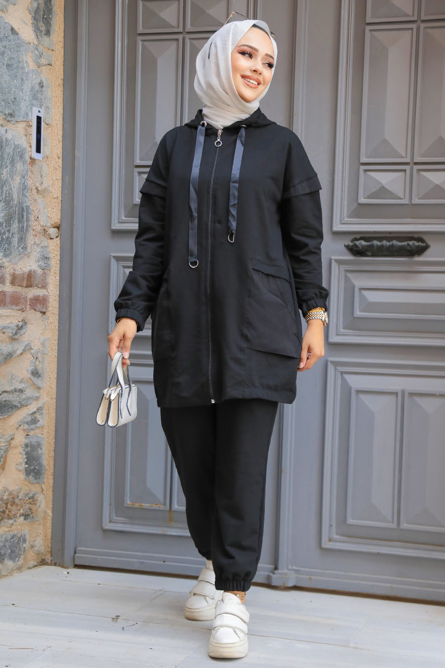 Ürün Özelliği: Sıfır yaka, kapşonlu, uzun kollu, kol ucu lastikli, yanlardan cep detaylı, etek ucu lastikli, ön ortadan fermuarlı, pantolon belden lastikli ve paçası lastiklidir.