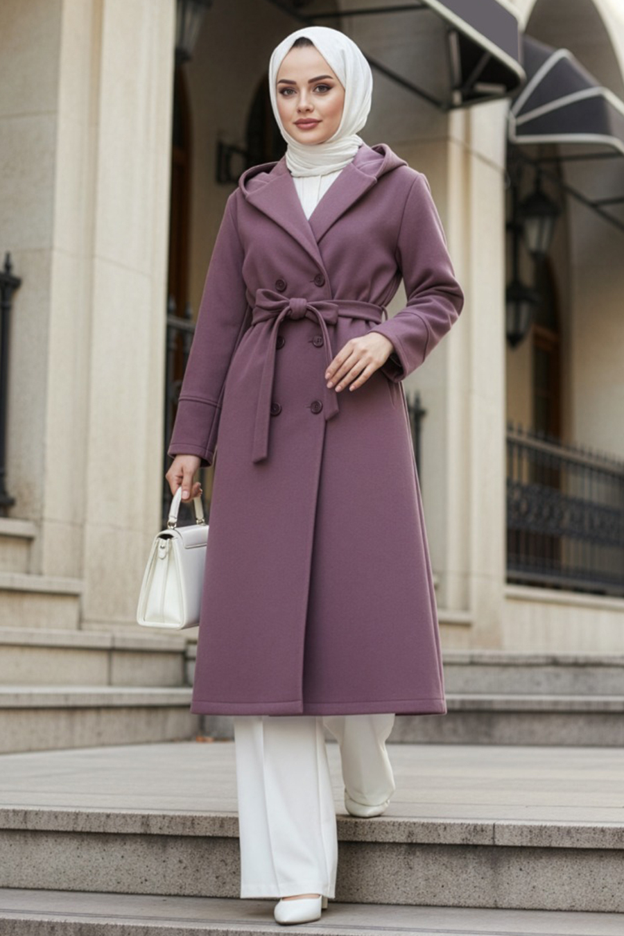 Ürün Özelliği: Sıfır yaka, kapüşonlu, uzun kollu, ön ortadan düğmeli ve kendi kumaşından kemerlidir.