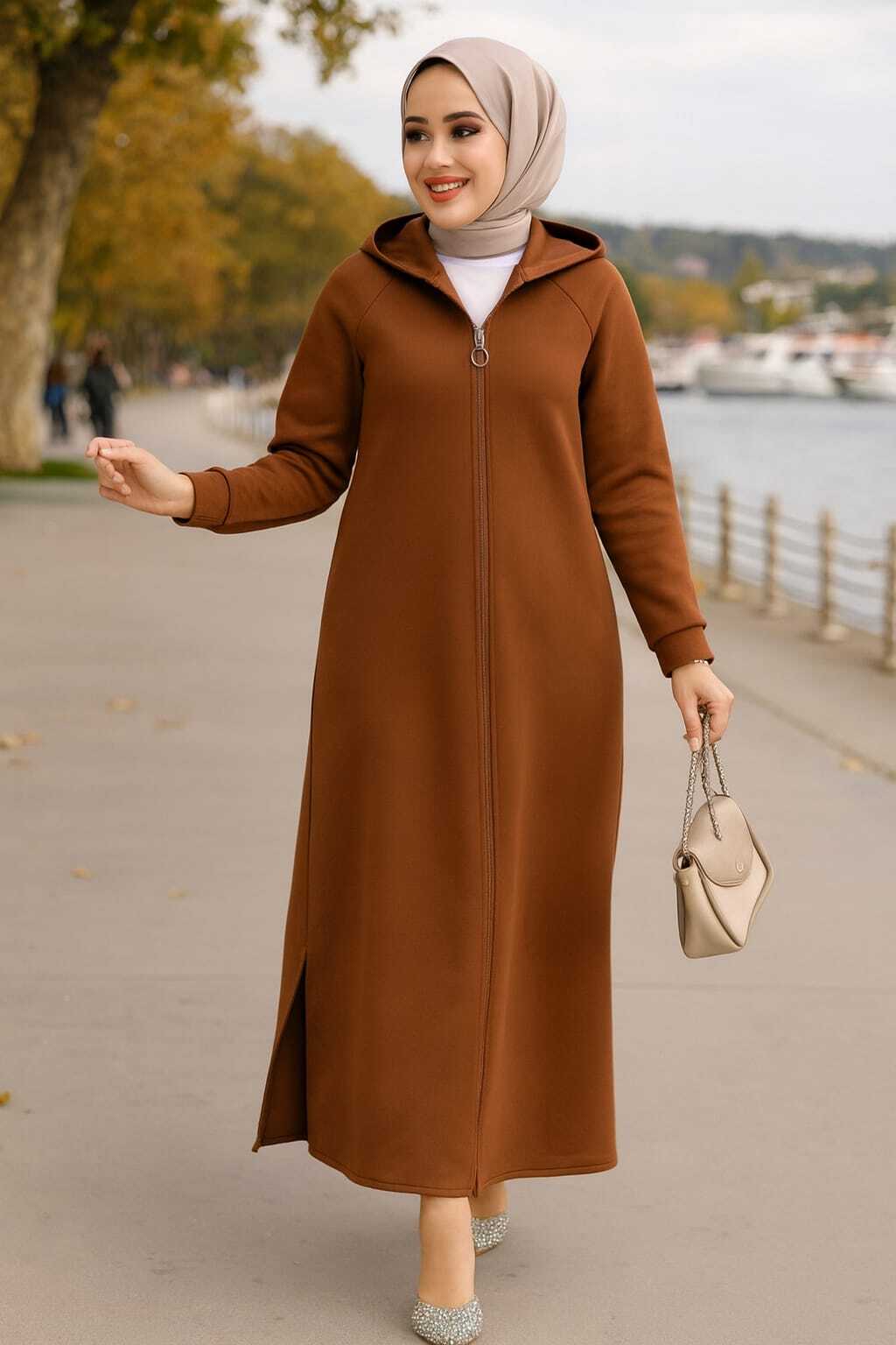 Kumaş Özelliği: %100 Polyester kumaştan üretilmiştir.Ürün Özelliği: Sıfır yaka, kapüşonlu, uzun kollu, yanlardan yırtmaç detaylı, yanlardan cepli ve ön ortadan fermuarlıdır.