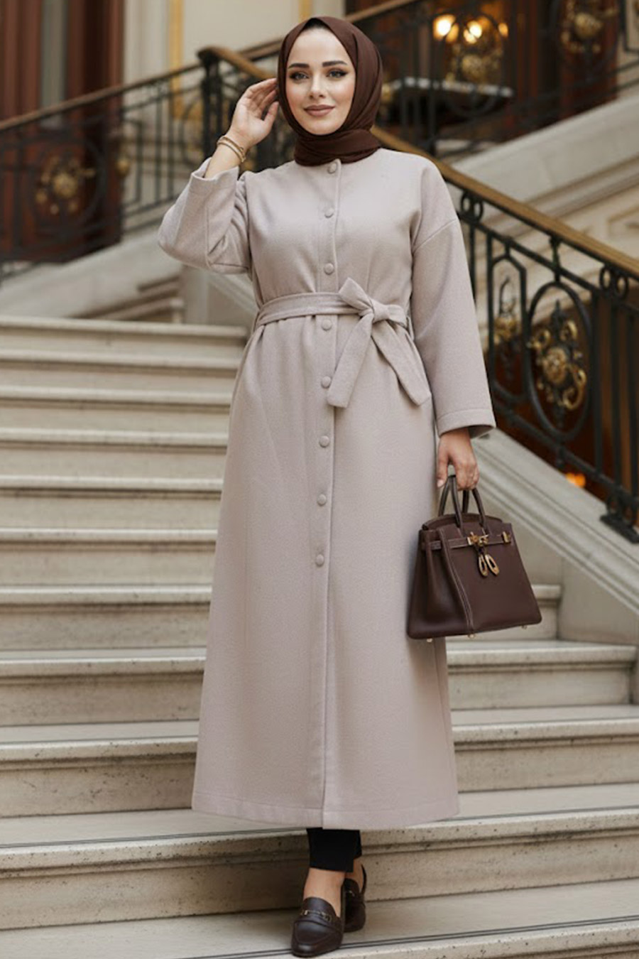 Kemerli Bej Kaşe Tesettür Kaban 61302BEJ