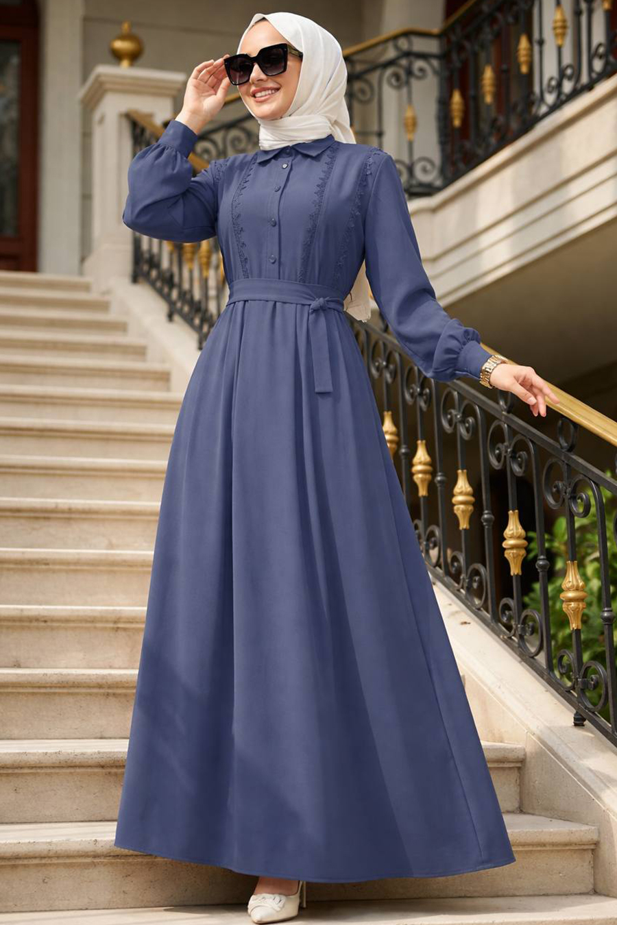 Ürün Özelliği: Klasik yaka, uzun kollu, manşetli, dantel detaylı, ön ortadan düğmeli ve kendi kumaşından kemerlidir.