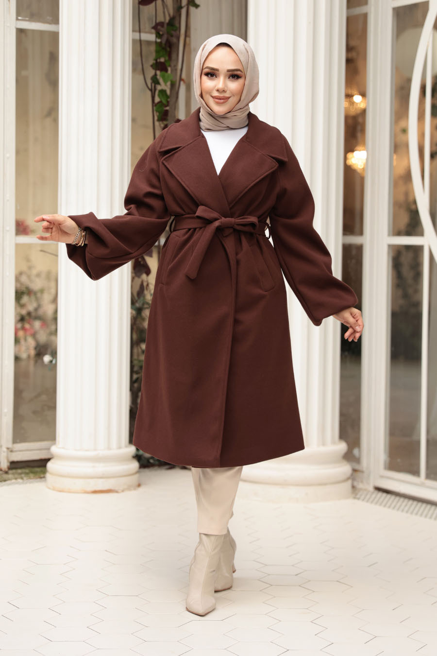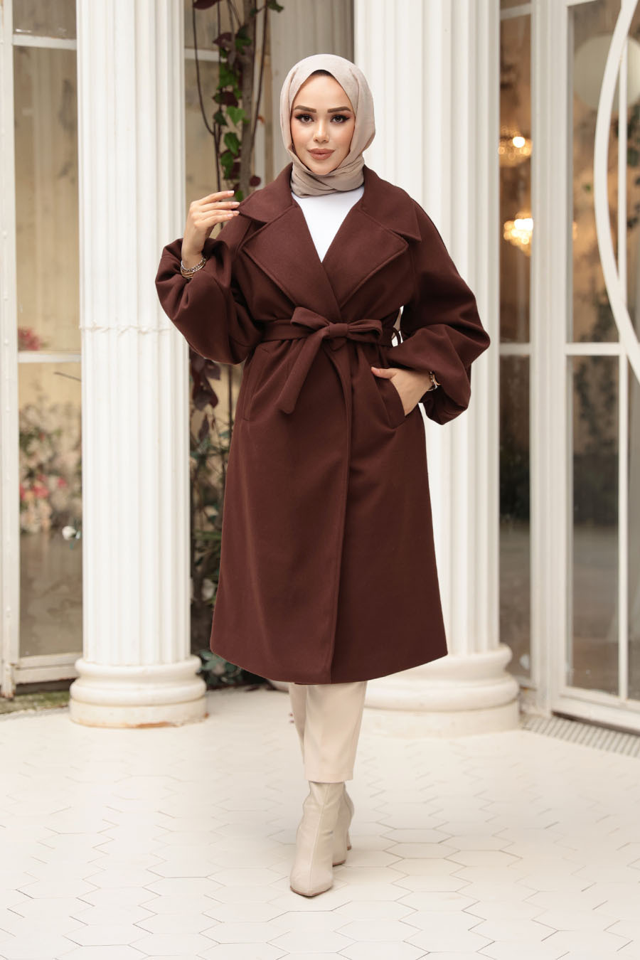 Ürün Özelliği: Klasik yaka, uzun kollu, kol ucu lastikli, yanlardan cepli ve kendi kumaşından kemerlidir.