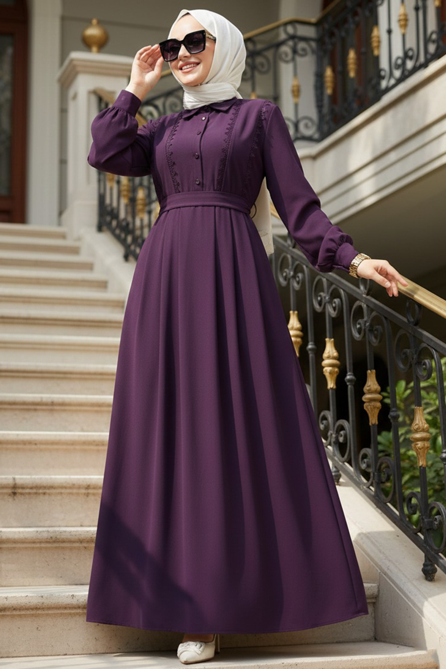 Ürün Özelliği: Klasik yaka, uzun kollu, manşetli, dantel detaylı, ön ortadan düğmeli ve kendi kumaşından kemerlidir.