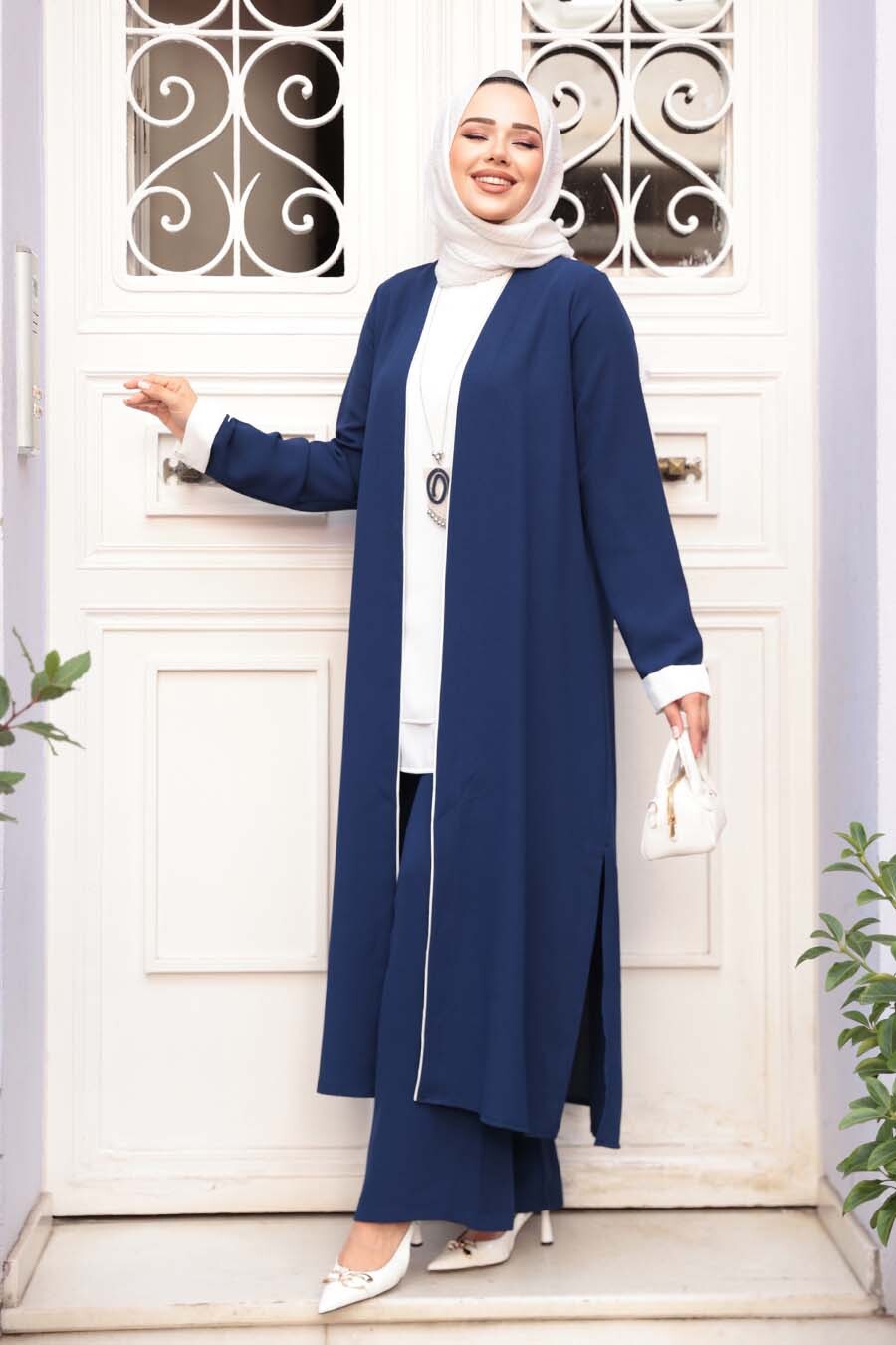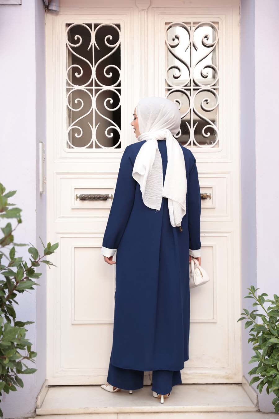 Ürün Özelliği:Sıfır yaka, uzun kollu, etek ucu yırtmaçlı, kolyeli, içlikli, pantolon belden lastikli ve geniş paçadır. Ürün Boyu:Üst:125 cm Alt:104 cm