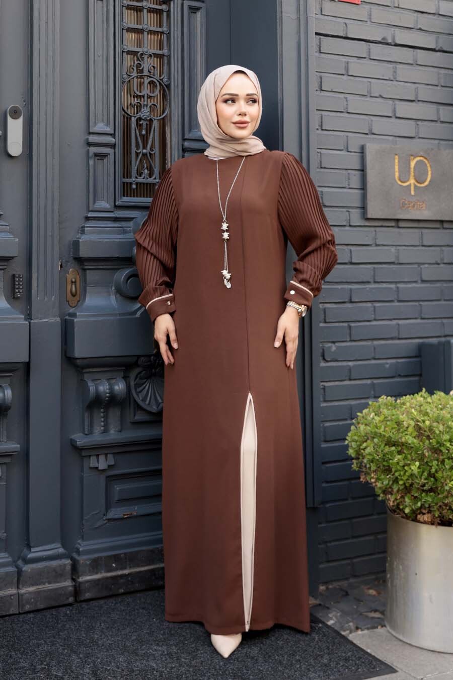 Ürün Özelliği: Sıfır yaka, uzun kollu, kol ucu lastikli, kolları pileli, ön ortadan yırtmaçlı, kolyeli ve pantolon boru paça ve belden lastiklidir.