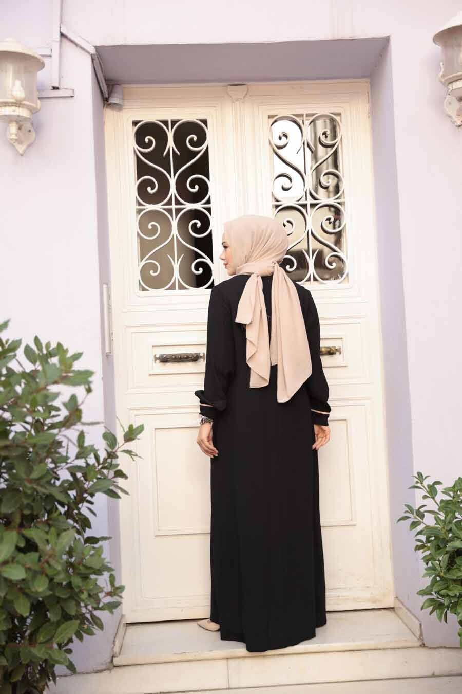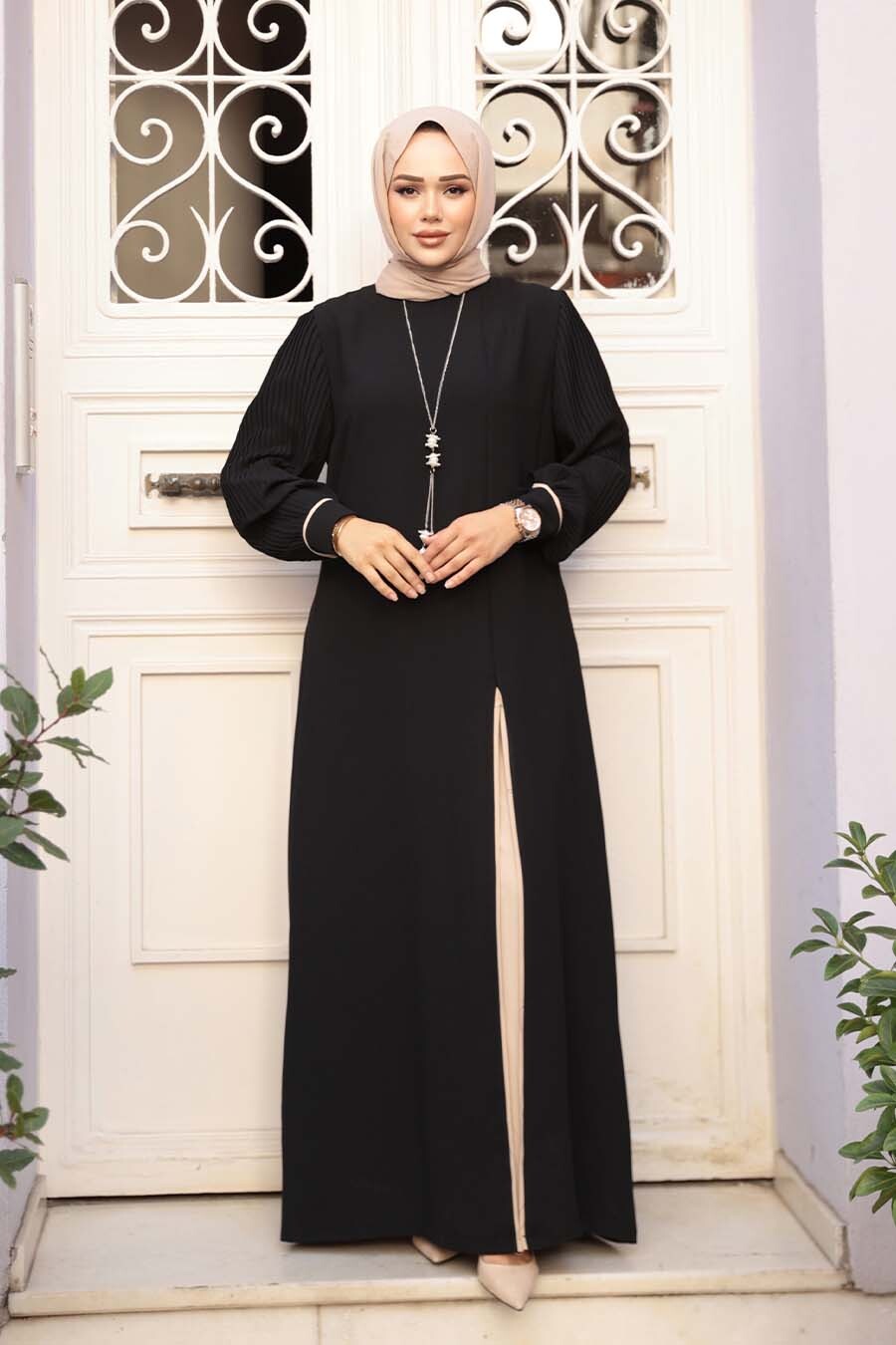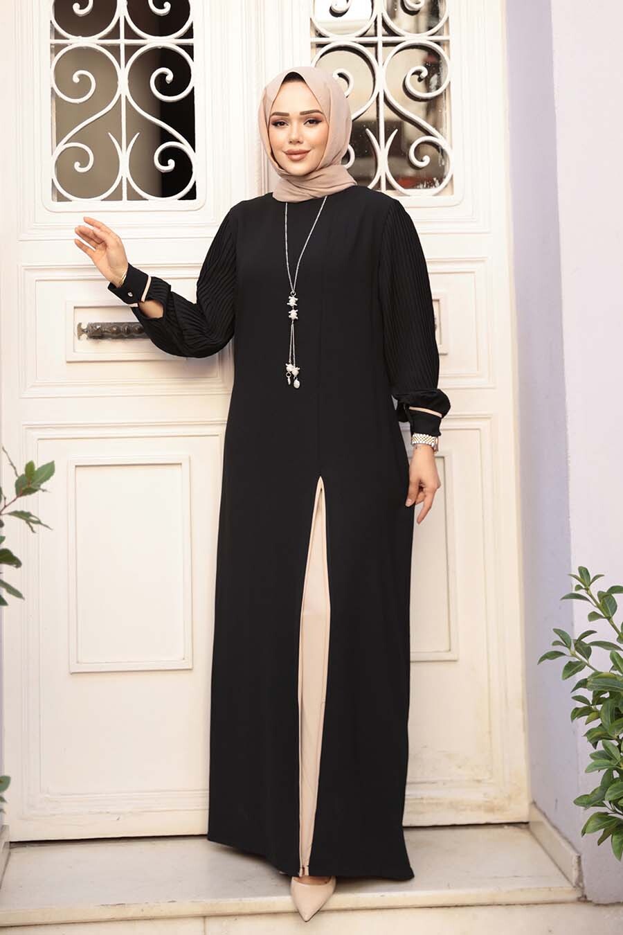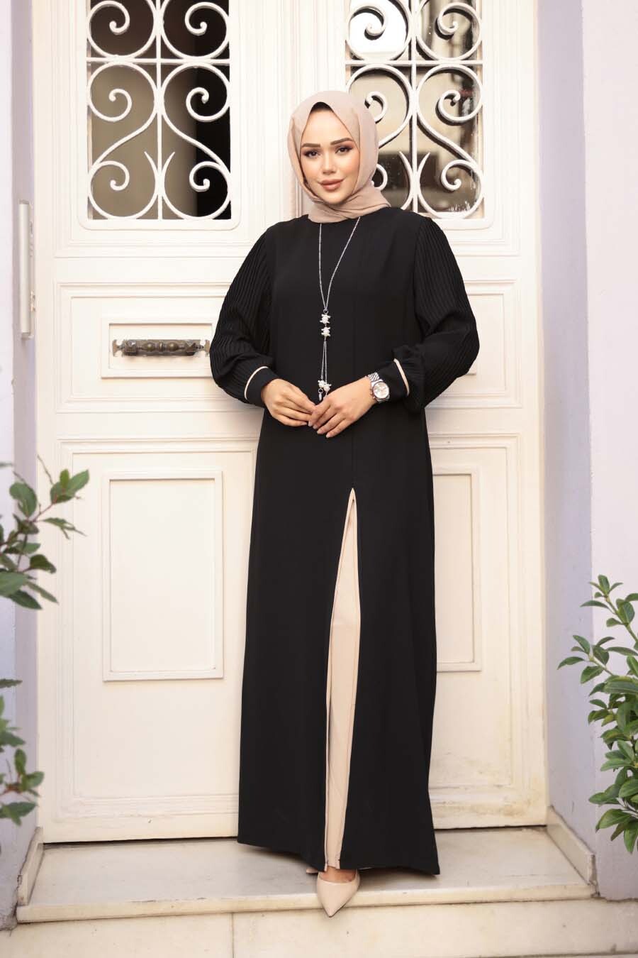 Ürün Özelliği: Sıfır yaka, uzun kollu, kol ucu lastikli, kolları pileli, ön ortadan yırtmaçlı, kolyeli ve pantolon boru paça ve belden lastiklidir.