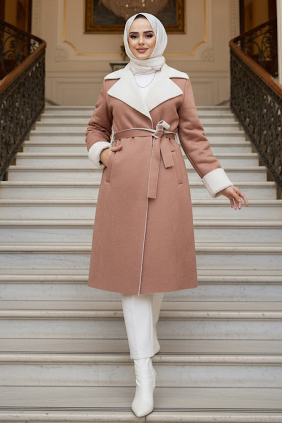 Ürün Özelliği: Klasik yaka, uzun kollu, kürklü, yanlardan cepli ve kendi kumaşından kemerlidir.