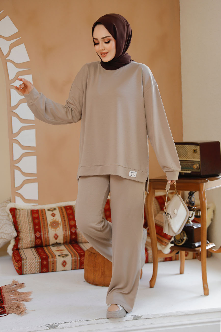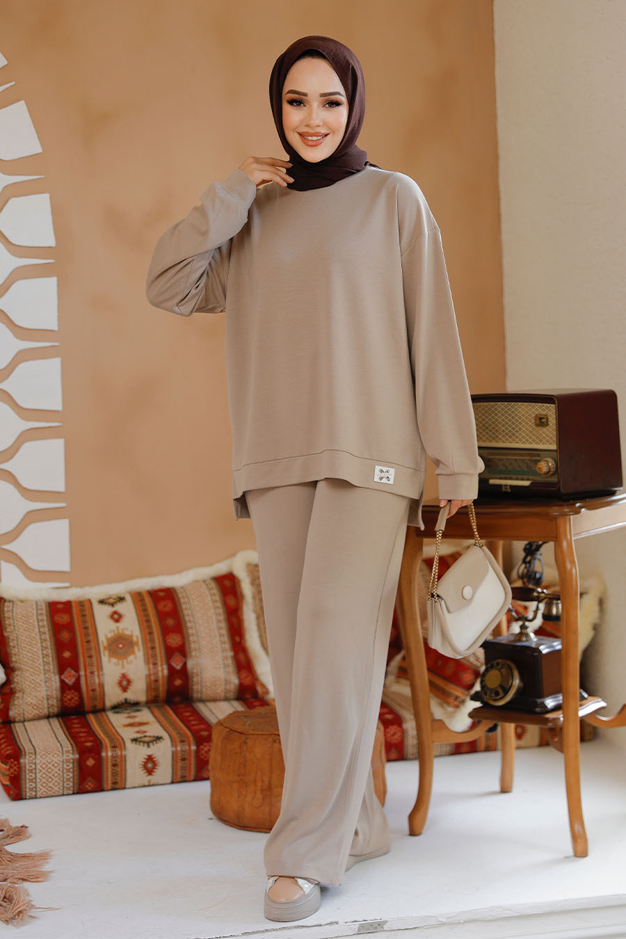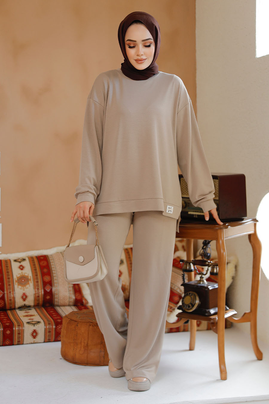 Ürün Özelliği: Sıfır yaka, uzun kollu, pantolon belden lastikli ve boru paçadır.