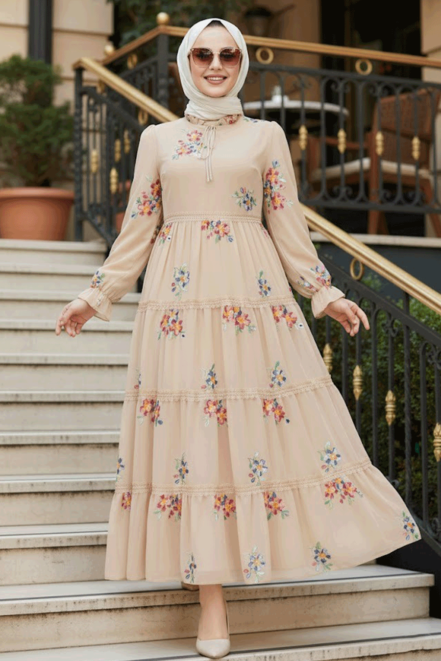 Modest Beige Floral Long Dress 32815BEJ