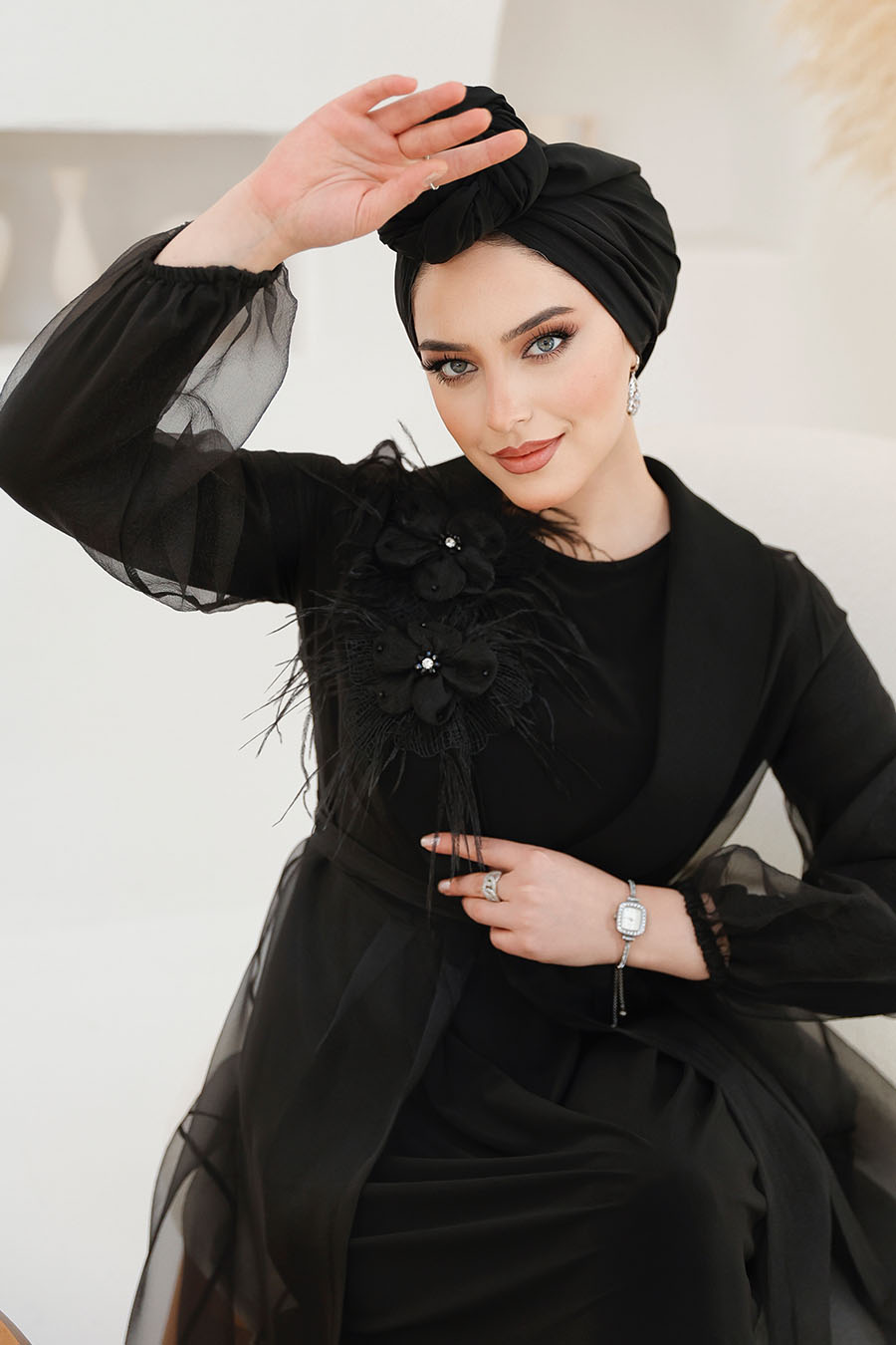 Tesettürlü Abiye Elbise - Balon Kol Siyah Tesettür Abiye Elbise 62381S