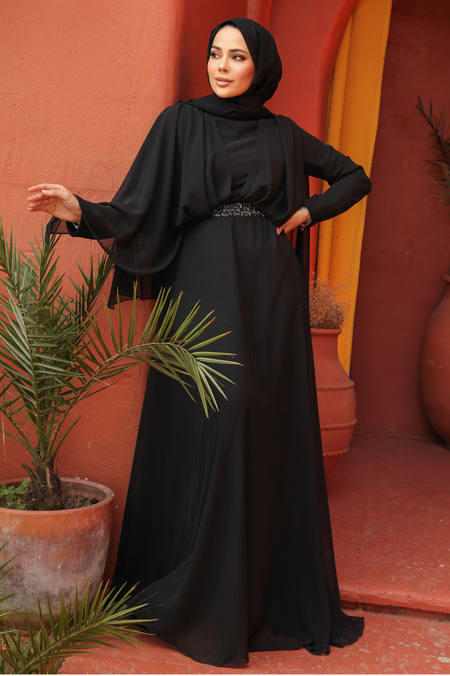 Tesettürlü Abiye Elbise - Payet Boncuk İşlemeli Siyah Tesettür Abiye Elbise 47963S