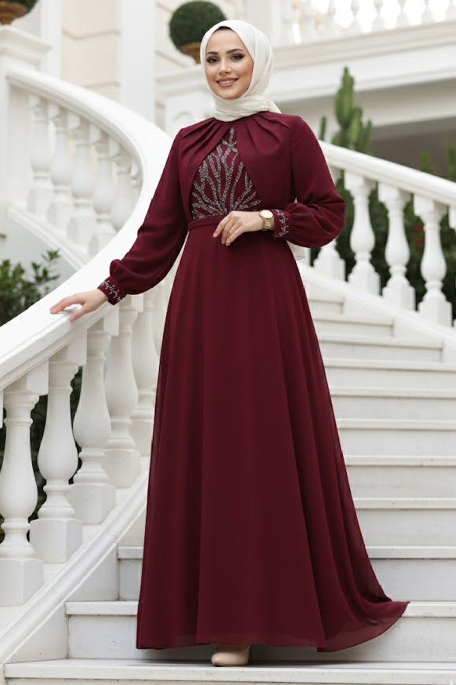 Tesettürlü Abiye Elbise - Boncuk Detaylı Bordo Tesettür Abiye Elbise 55212BR
