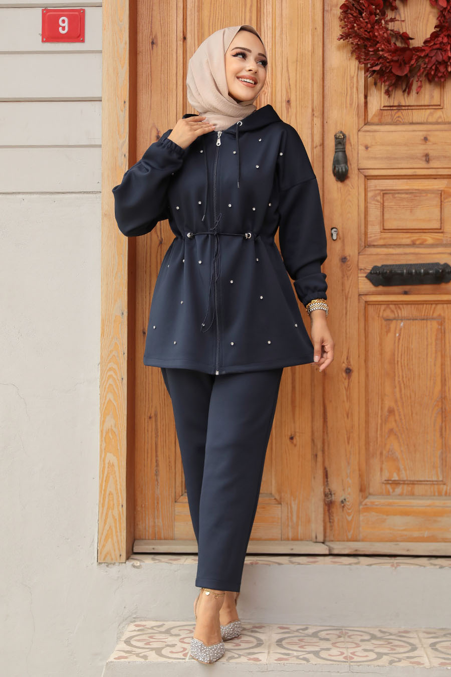 Boncuk İşlemeli Açık Lacivert Tesettür Abaya 29110AL
