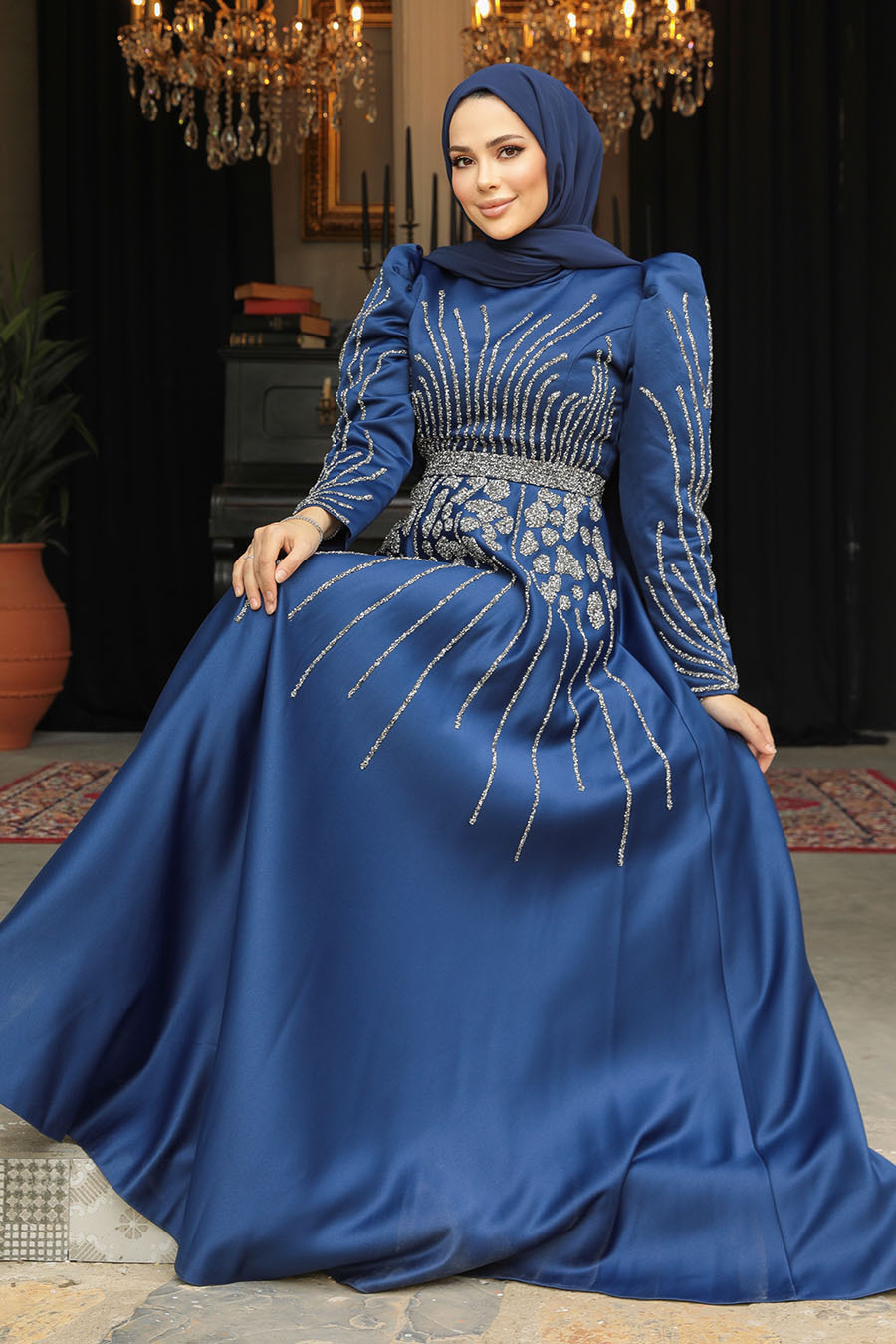 Tesettürlü Abiye Elbise - Boncuk Detaylı Lacivert Tesettür Abiye Elbise 55212L