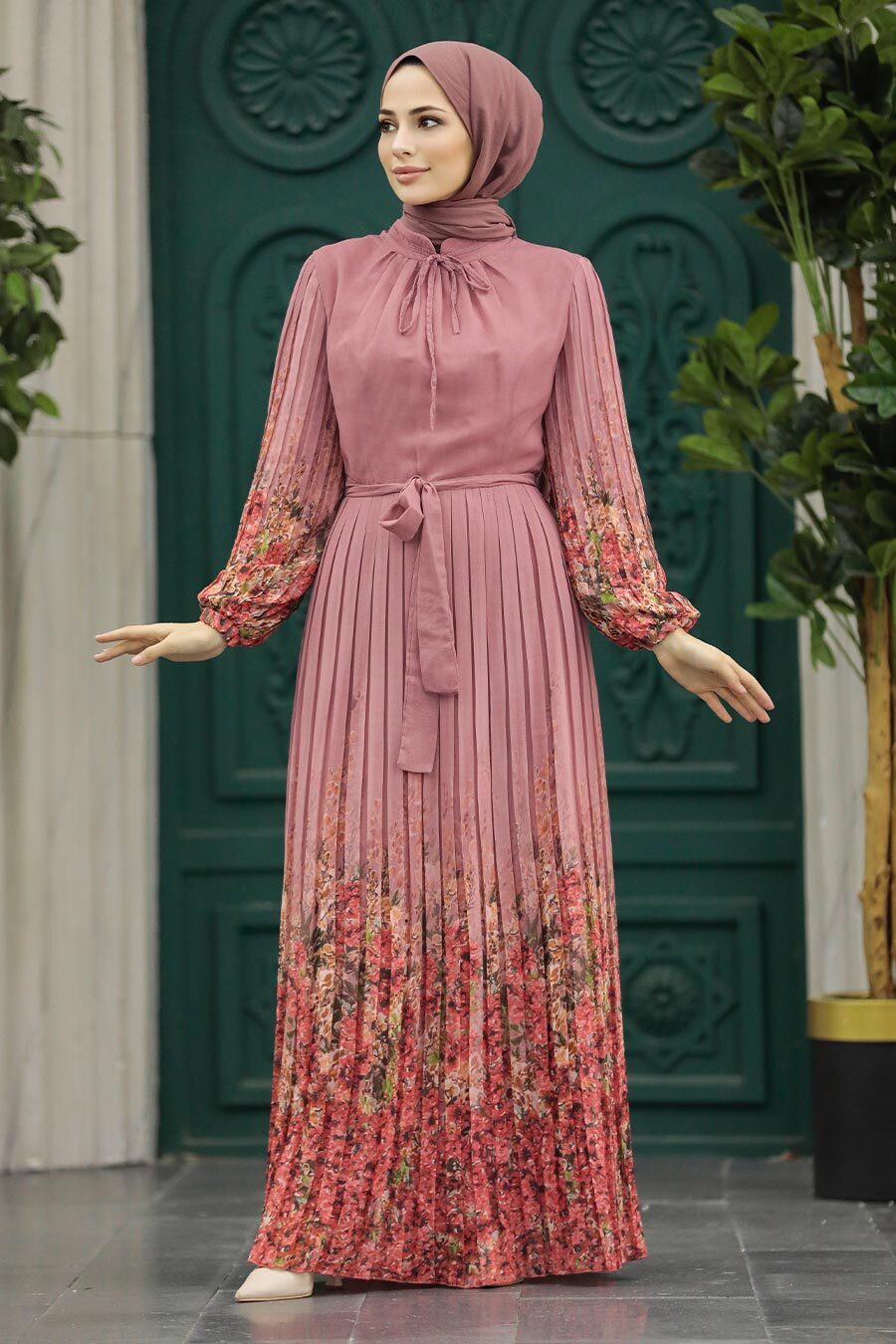 Kumaş Özelliği: %80 Polyester %20 Pamuklu Kumaştan üretilmiştir.Ürün Özelliği: Dik yaka, yakası bağcıklı, uzun kollu, kol ucu lastikli, çiçek desenli, pileli, arka ortadan fermuarlı ve astarlıdır.