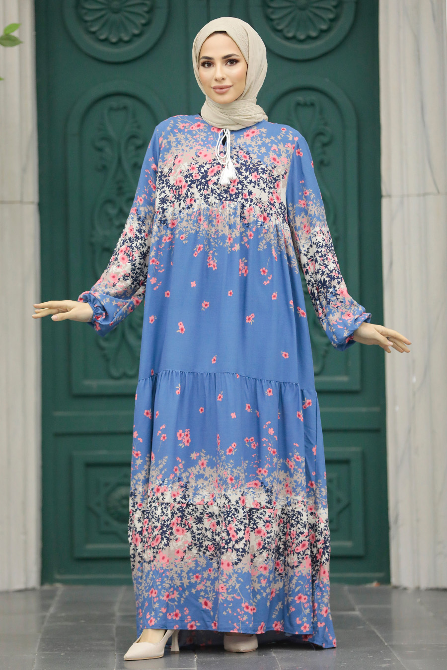 Ürün Özelliği: Sıfır yaka, yakası bağcıklı, uzun kollu, kol ucu lastikli, çiçek desenli ve pilise detaylıdır.