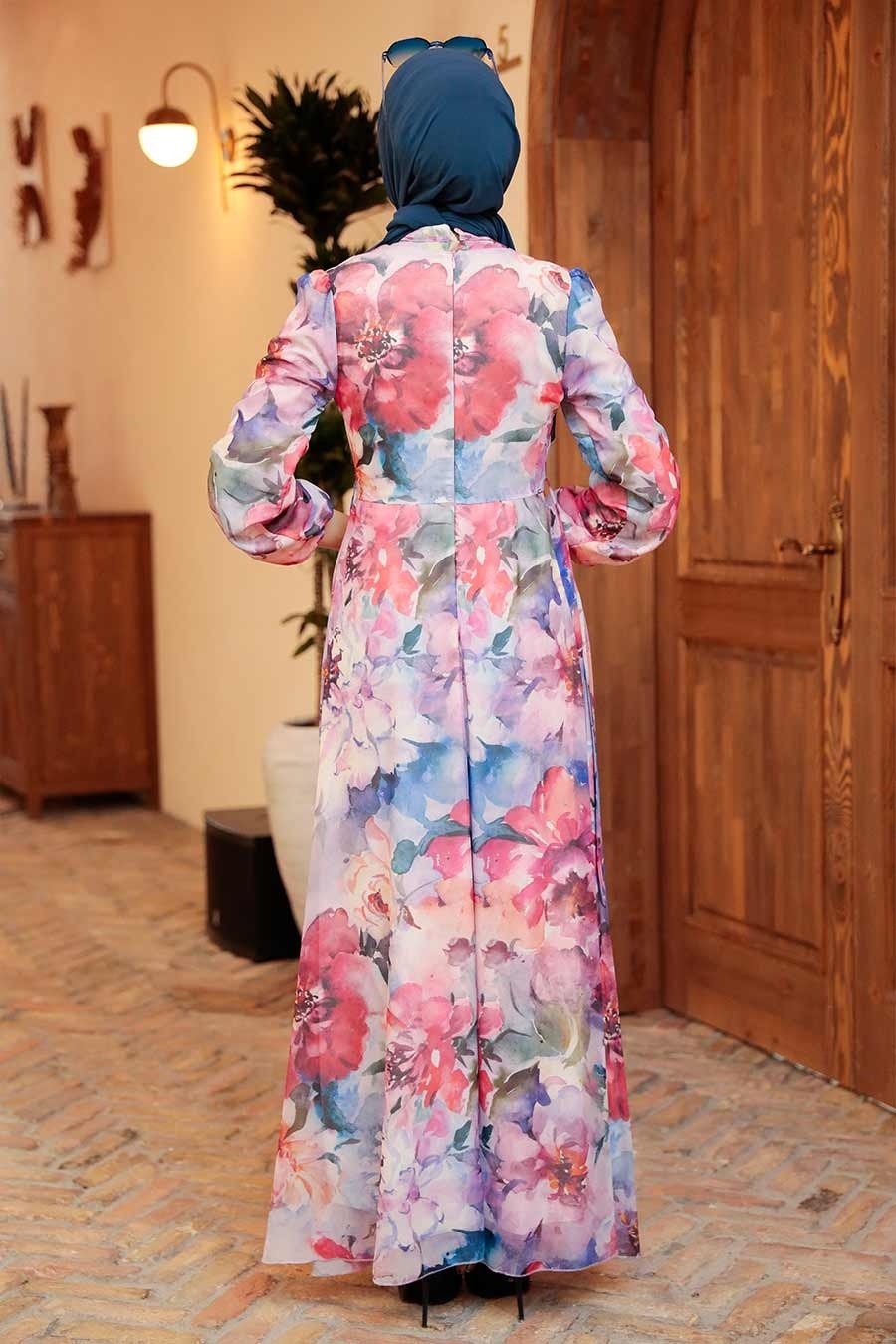 Kumaş Özelliği: %98 Polyester %2 Elastan kumaştan üretilmiştir.Ürün Özelliği: Yakası bağcıklı, uzun kollu, kol ucu lastikli, desenli ,arka ortadan fermuarlı, astarlı ve kendi kumaşından kemerlidir.