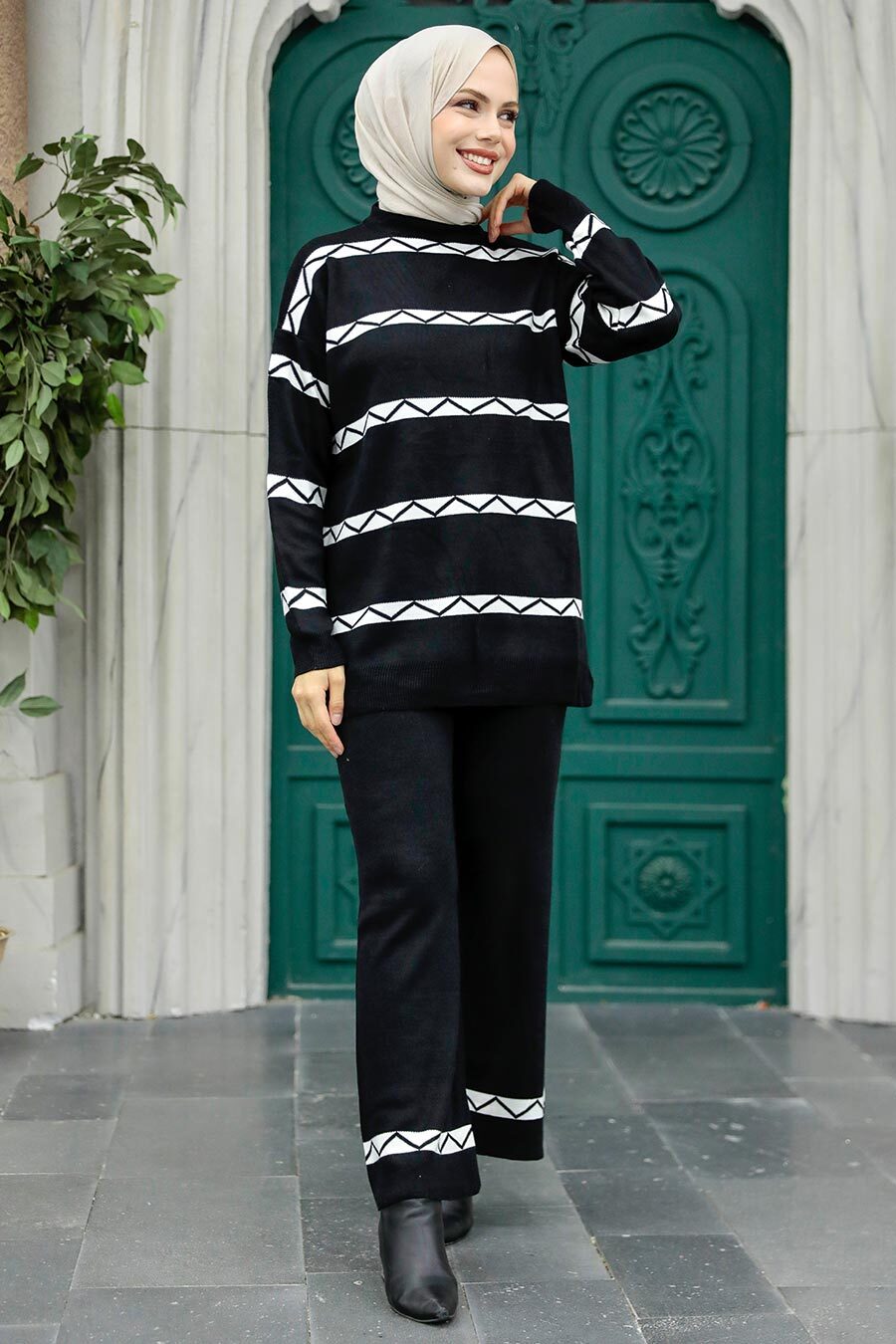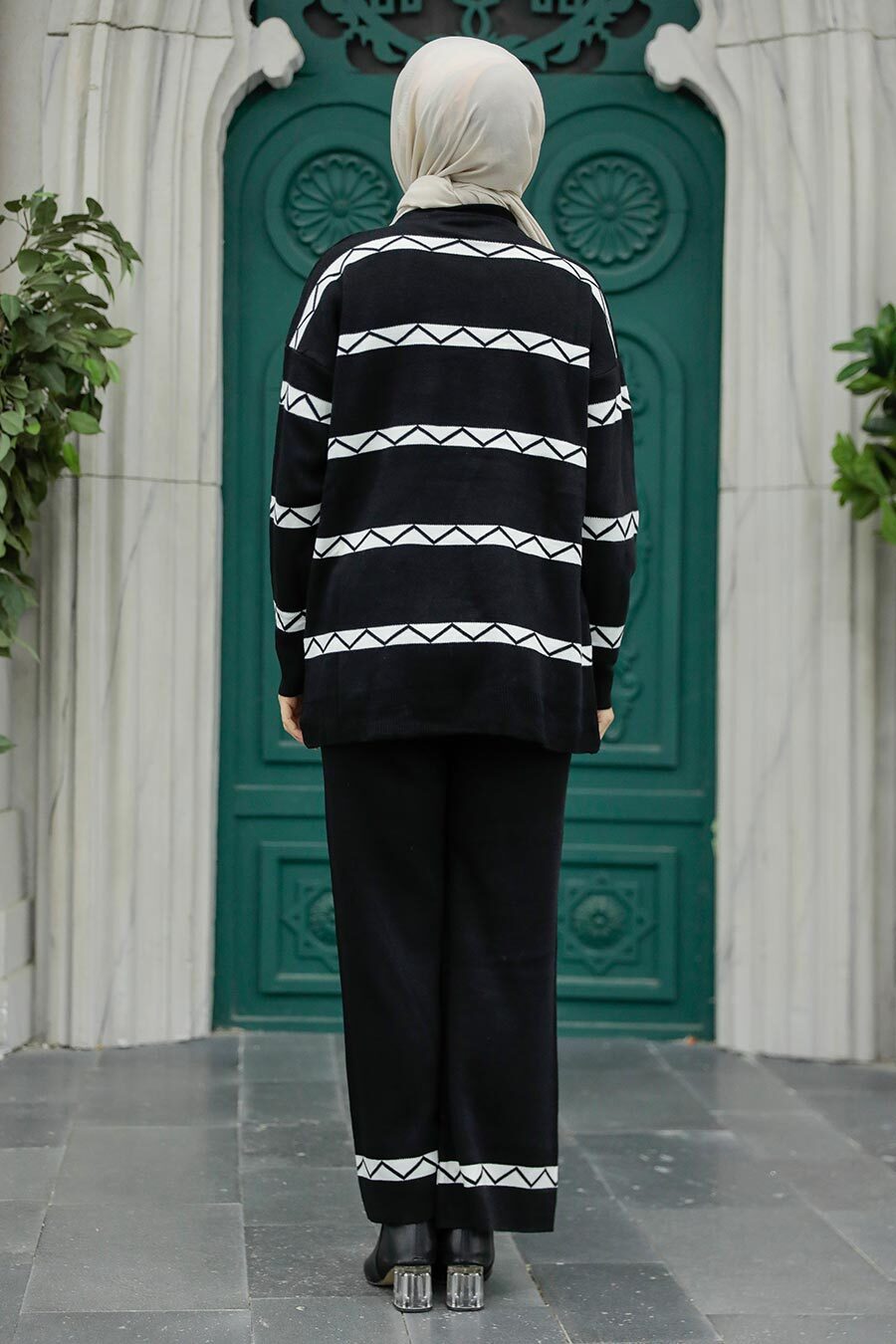 Ürün Özelliği: Sıfır yaka, uzun kollu, çizgi desenli, pantolon belden lastikli ve geniş paçadır.