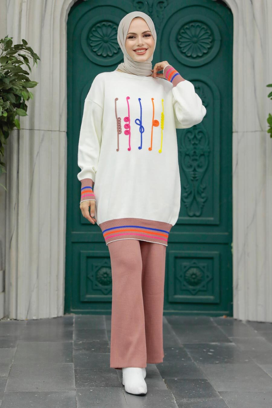 Ürün Özelliği: Sıfır yaka, uzun kollu, kol ucu lastikli, desenli, etek ucu lastikli, pantolon belden lastikli ve geniş paçadır.