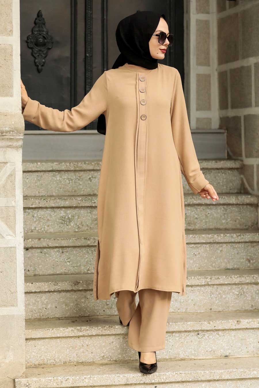 Kumaş Özelliği: %50 Viscon %25 Likra %25 Polyester Kumaştan üretilmiştir.Ürün Özelliği: Dik yaka, uzun kollu, düğme detaylı, arka ortadan fermuarlı, yırtmaçlı, pantolon belden lastikli ve boru paçadır.