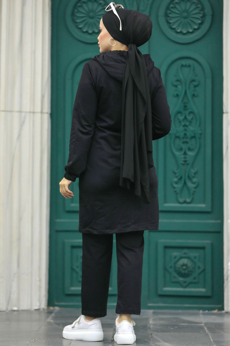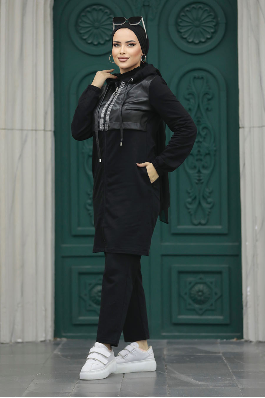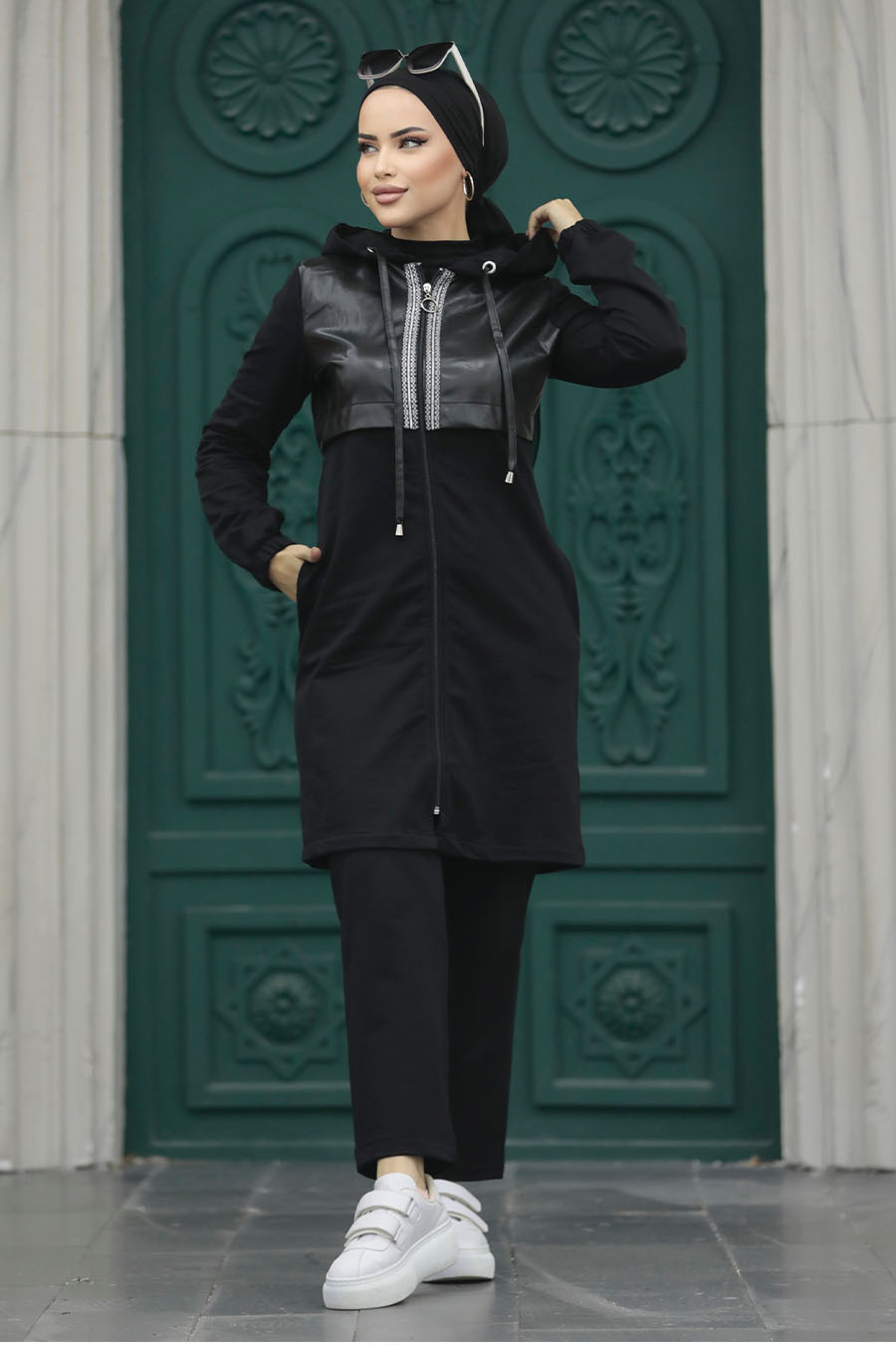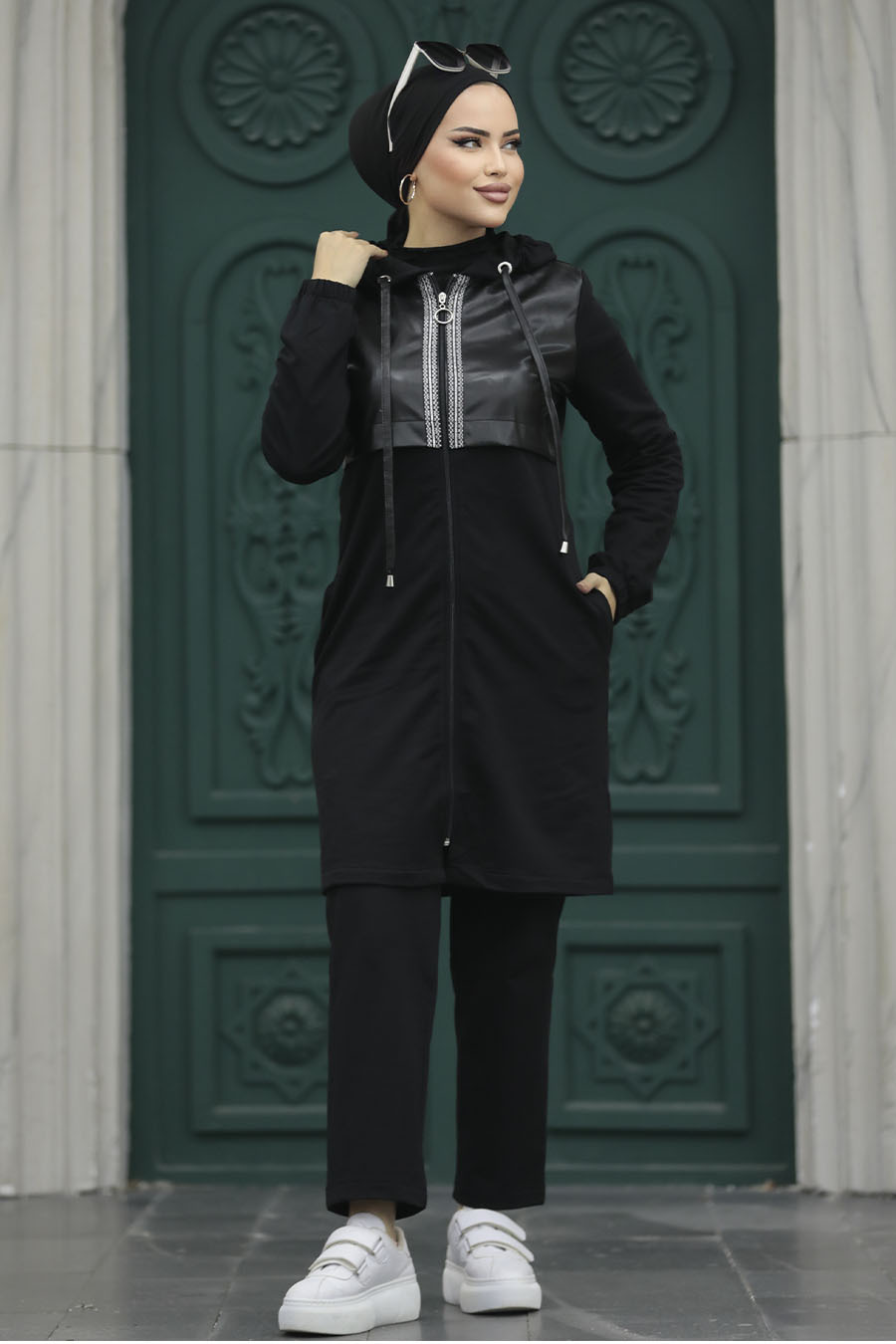 Ürün Özelliği: Dik yaka, uzun kollu, kol ucu lastikli, ön ortadan fermuarlı, deri detaylı, yanlardan cepli, pantolon belden lastikli ve boru paçadır.