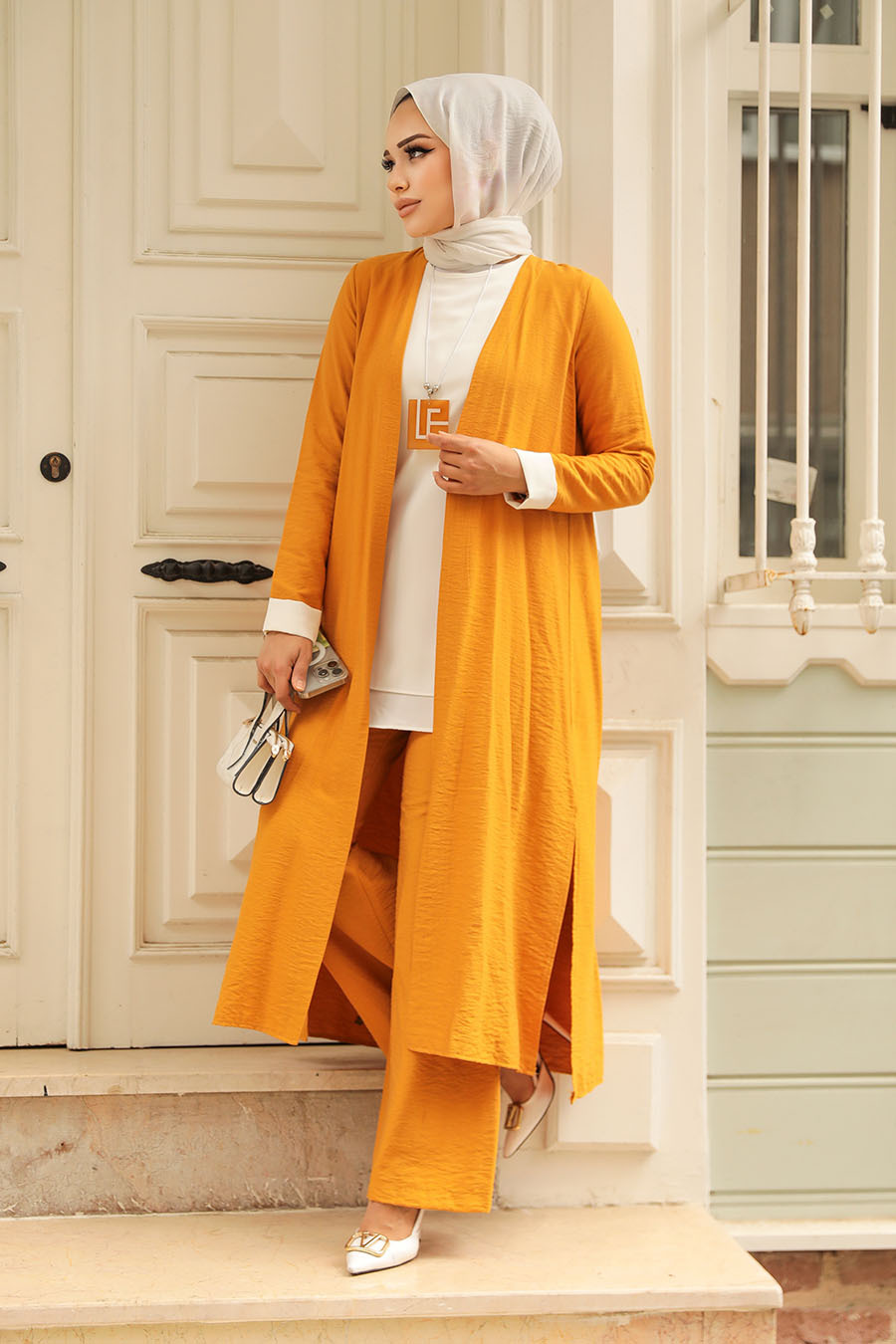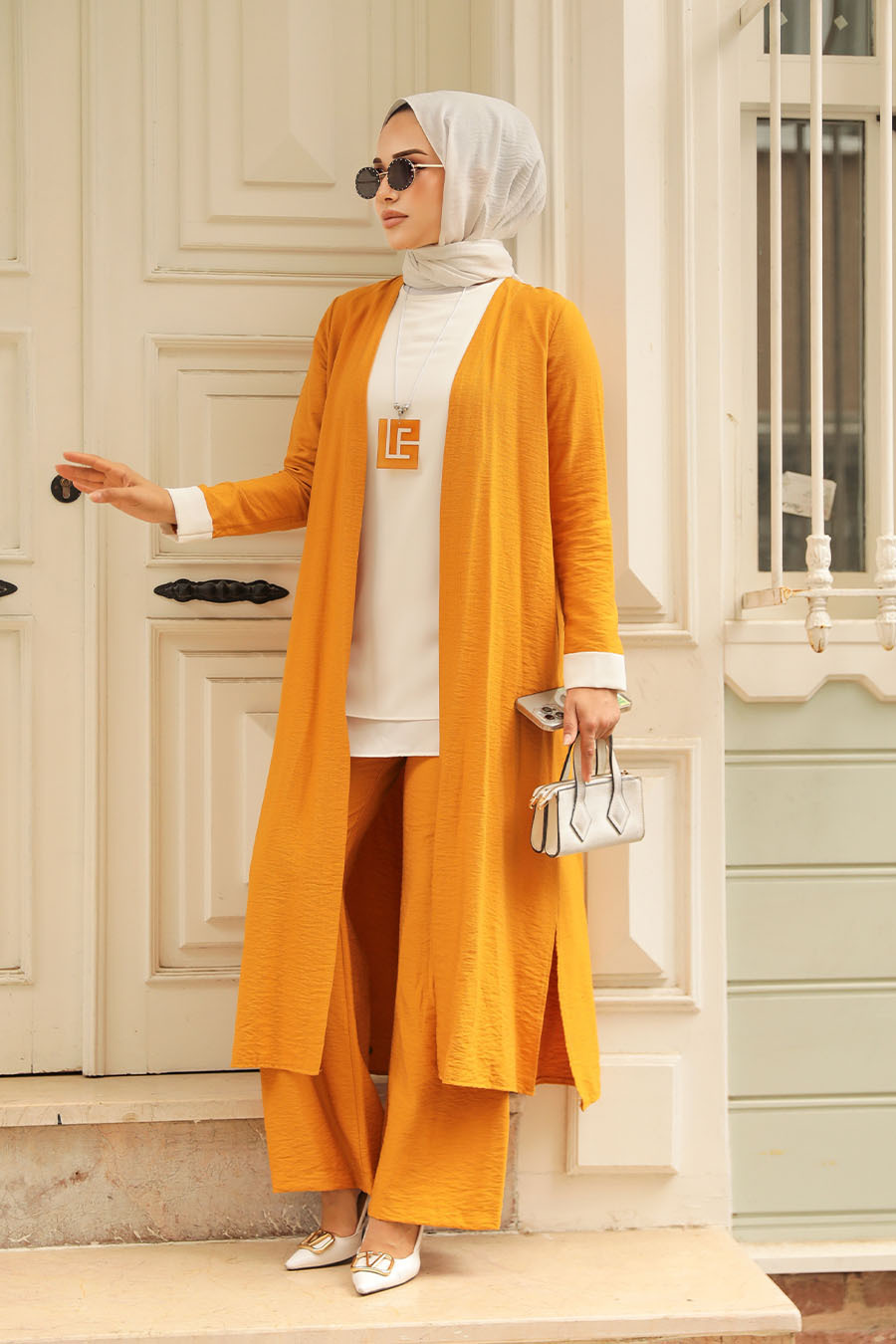 Ürün Özelliği: Sıfır yaka, uzun kollu, kolyeli, yelek sıfır yaka, uzun kollu, etek ucu yırtmaçlı, pantolon belden lastikli ve geniş paçadır. Ürün Boyu:Üst:124 cm Alt:75 cm iç:75 cm