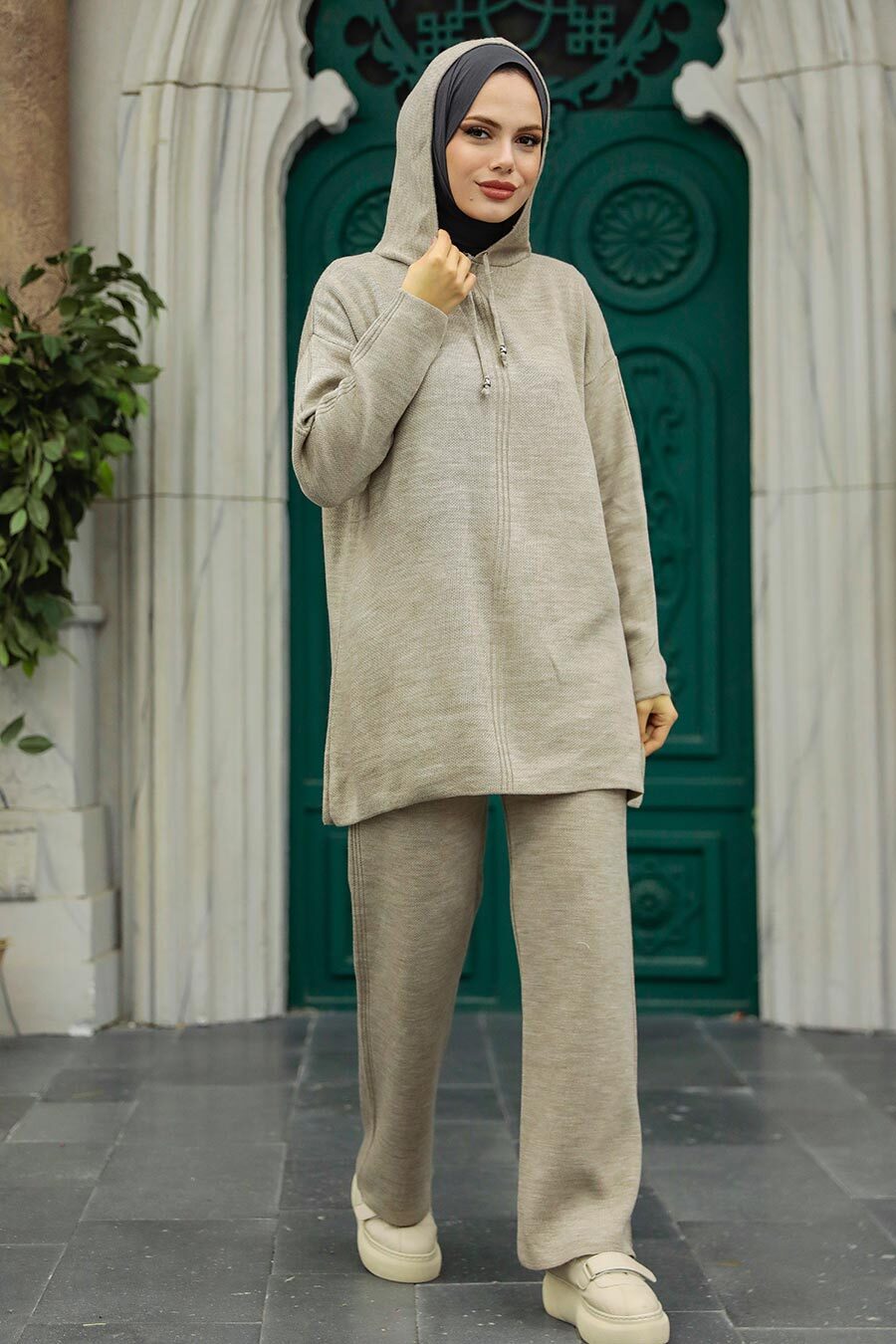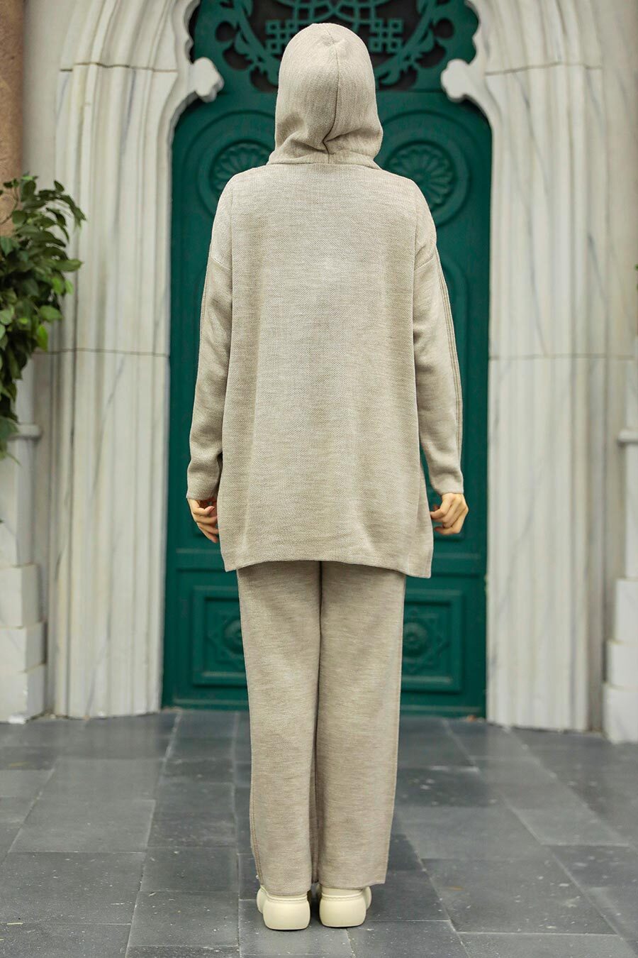 Ürün Özelliği: Sıfır yaka, kapüşonlu, uzun kollu, etek ucu yırtmaç detaylı, pantolon belden lastikli ve geniş paçadır.