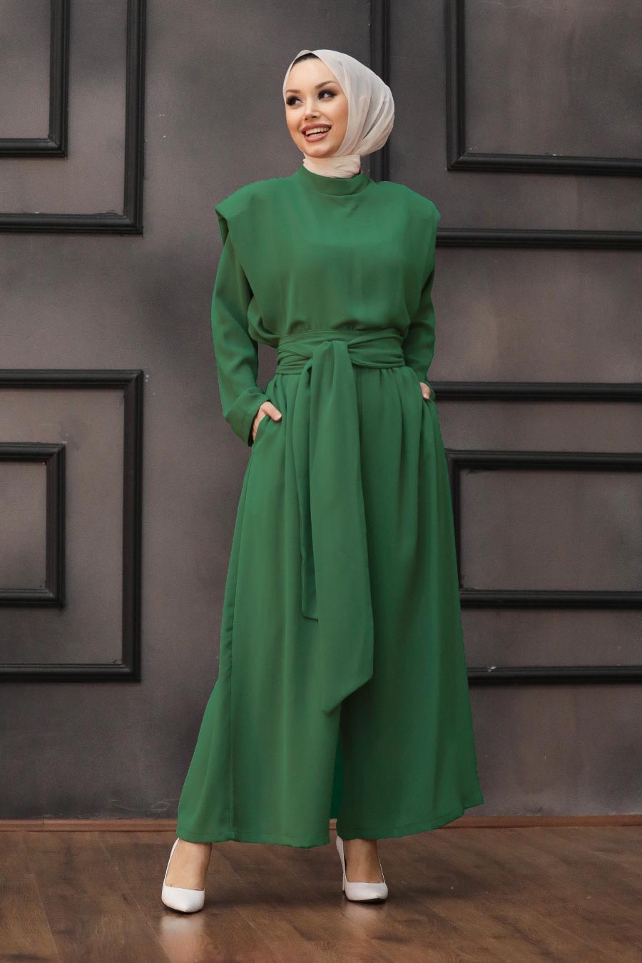 Ürün Özelliği: Dik yaka, uzun kollu, omuzları vatkalı, arka ortadan fermuarlı, kuşaklı, pantolon bol paça, yandan cepli ve lastiklidir.