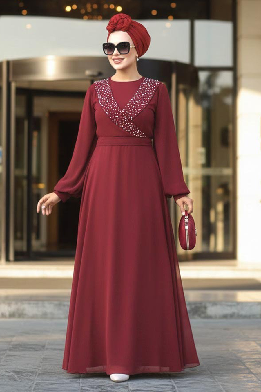 Tesettürlü Abiye Elbise - Dalga Desen Büzgülü Bordo Tesettür Abiye Elbise 5538BR