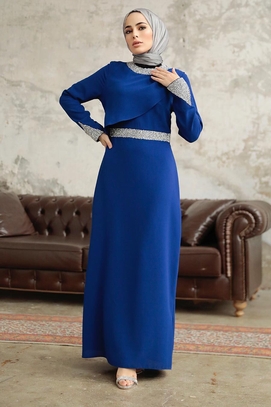 Neva Style - Satin Sax Blue Islamic Long Sleeve Maxi Dress 38031SX