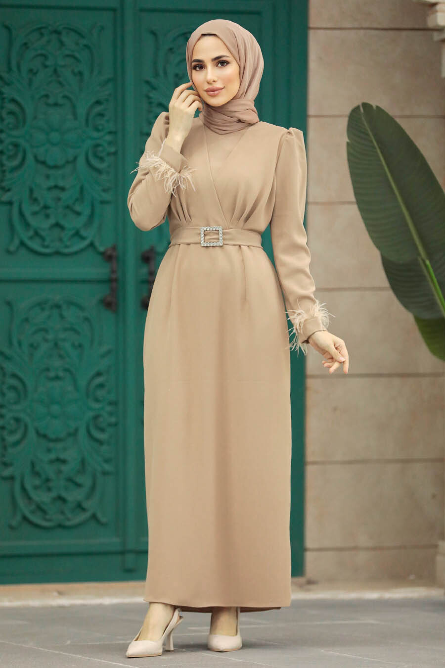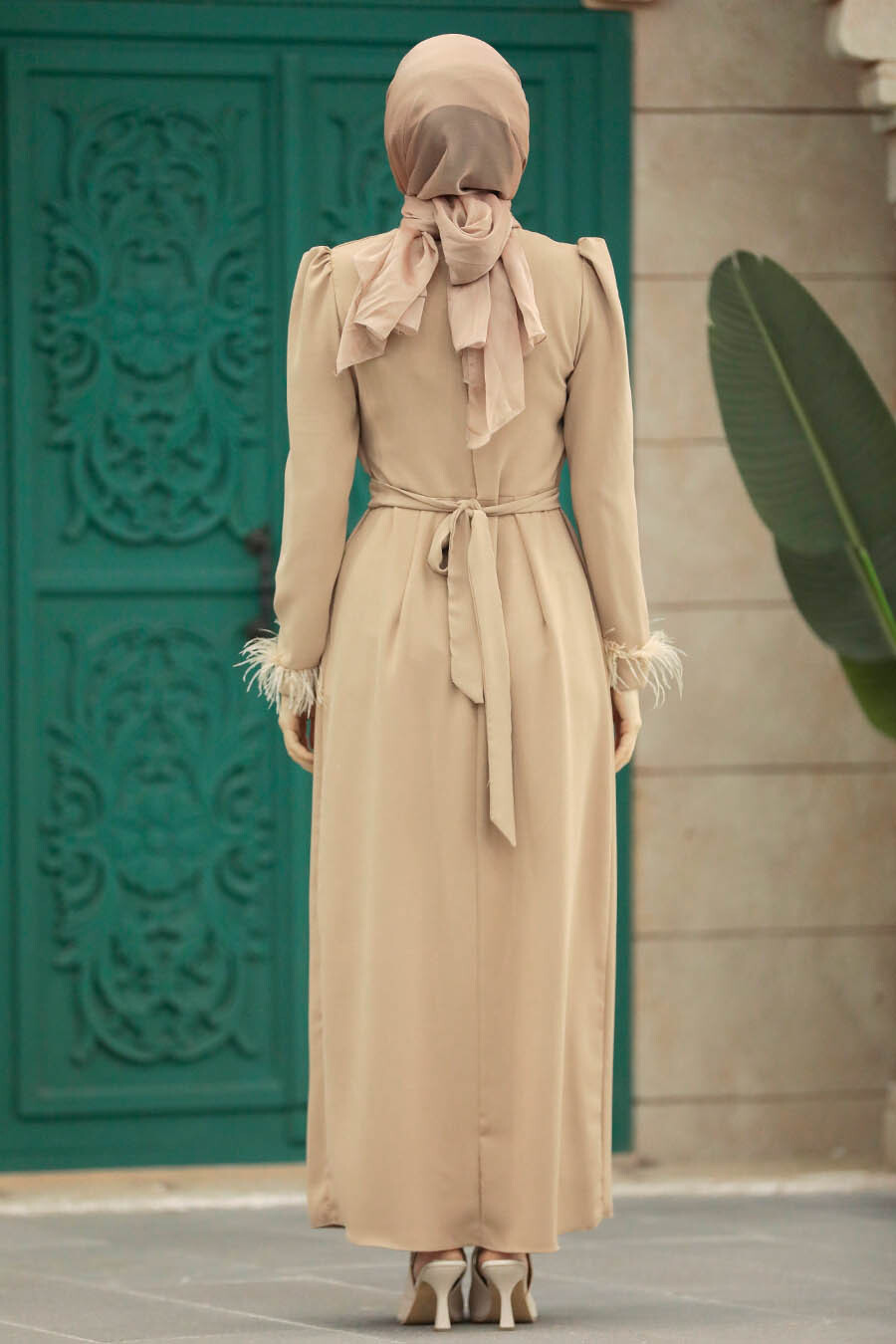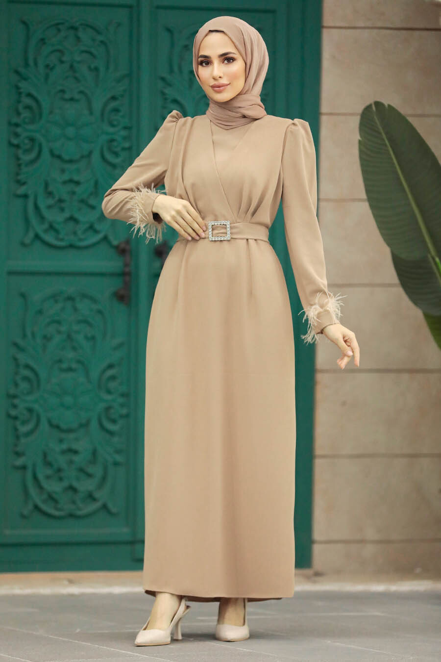 Ürün Özelliği: Sıfır yaka, uzun kollu, kol ucu tüy detaylı, drape detaylı, arka ortadan fermuarlı ve tokalı kemerlidir.