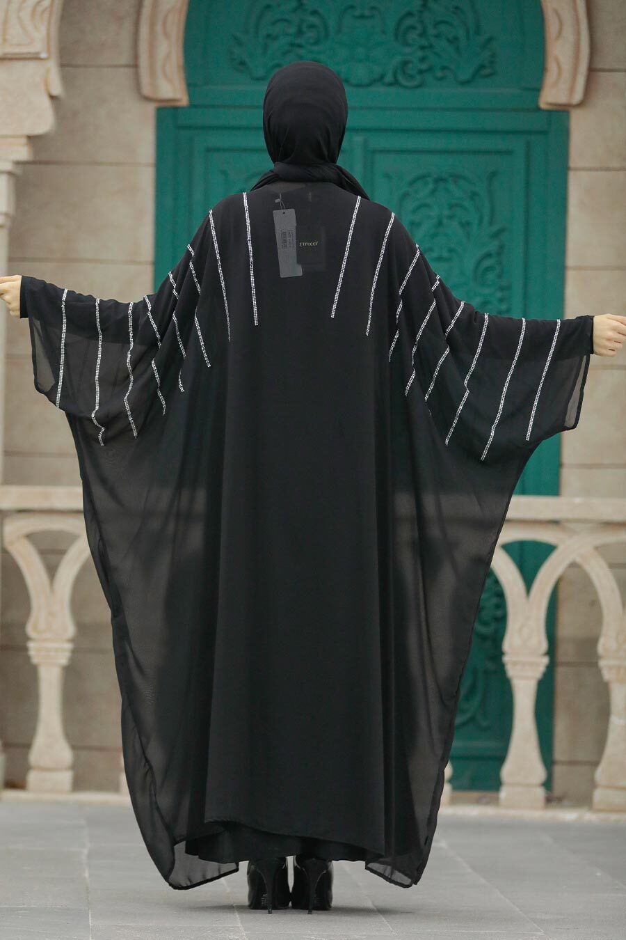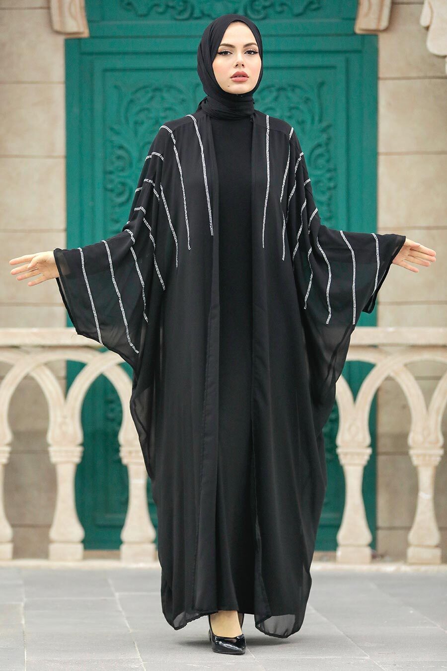 Kumaş Özelliği: %100 Polyester kumaştan üretilmiştir.Ürün Özelliği: Sıfır yaka, uzun kollu, yarasa kol, şerit detaylı ve önü açık abayadır.