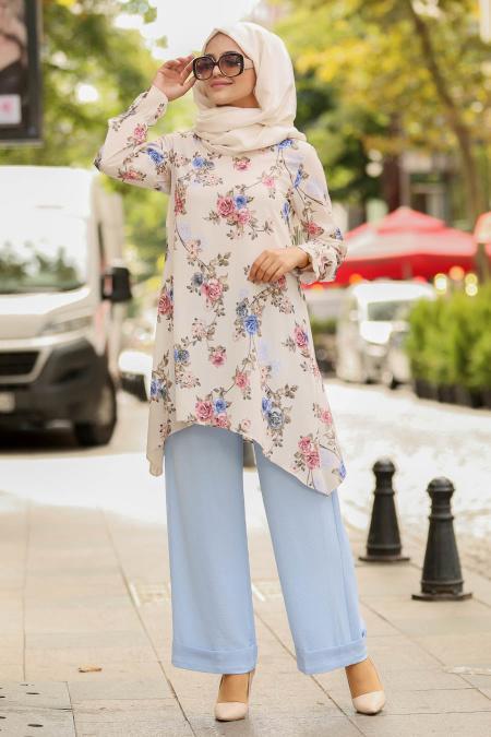 Ürün Özelliği | Ürün ikili takımdır. Üst tunik çiçek desenlidir. Arkadan düğme kapamalı, kollardan lastiklidir. Pantolon bol paça ve belden lastiklidir. |
